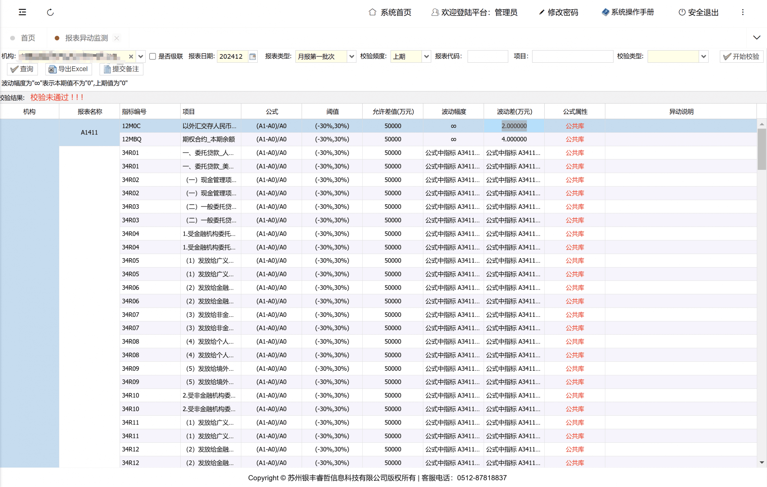 基于机构预设的质量规则,以完整表格形式呈现数据波动差及波动范围。用户选定监测机构、报表日期、监管频度及目标报表后,执行校验操作即可查看全表波动数据,并支持Excel格式导出监测结果(本功能监管异动监测的机构版本)。