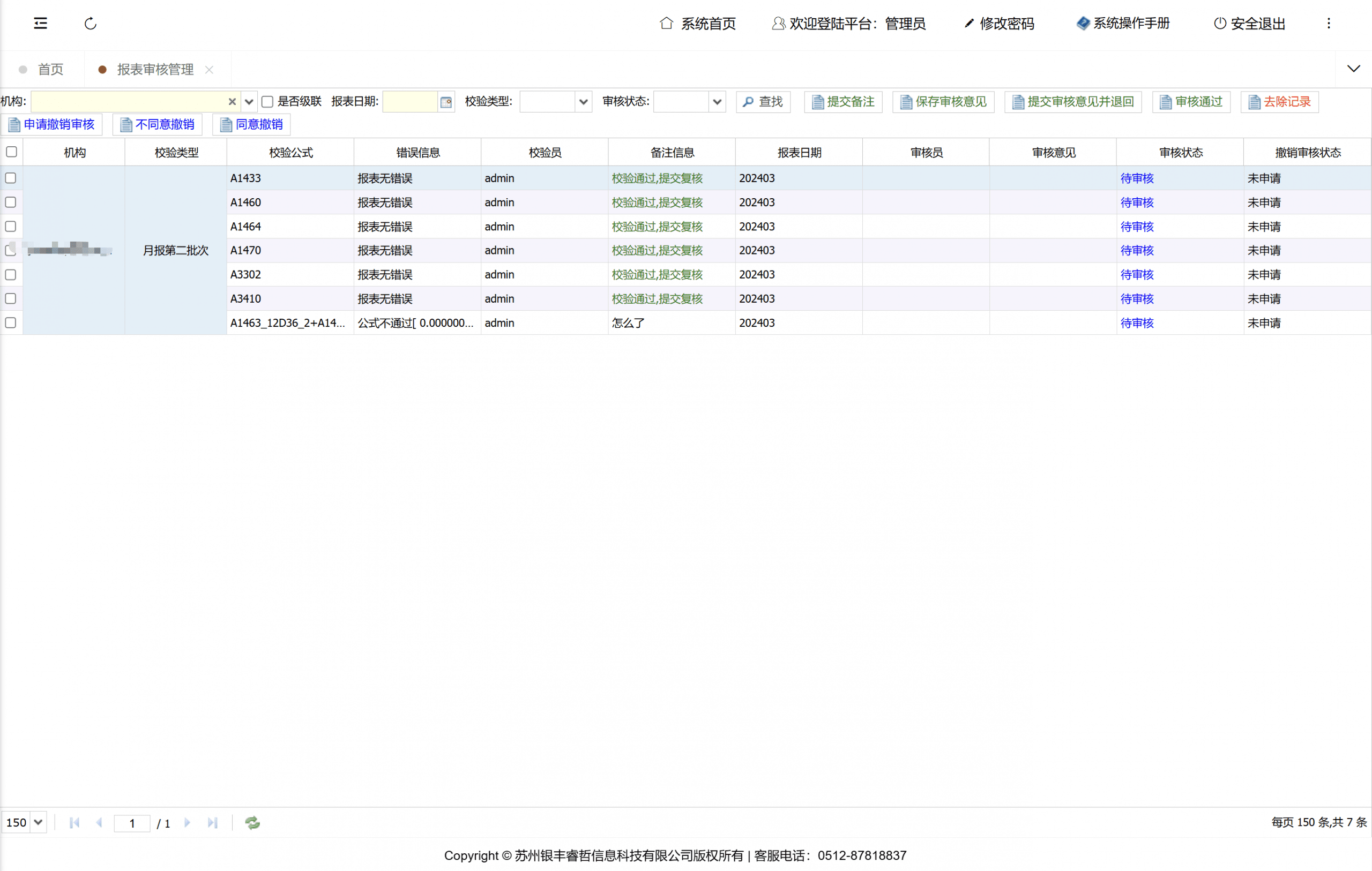 允许用户选择机构、报表日期和类型进行校验操作,生成可供查询和下载的校验结果。系统执行校验时将同时应用公共库规则和用户自建规则(不包括非admin用户定义的公式)。若所选报表尚未导入,系统将显示提示信息。用户可对校验错误添加备注并提交上级审核,校验通过的报表也可提交上级复核(相关审核记录可在报表审核管理处按权限和管辖机构查询)。所有校验结果均支持导出至Excel格式。