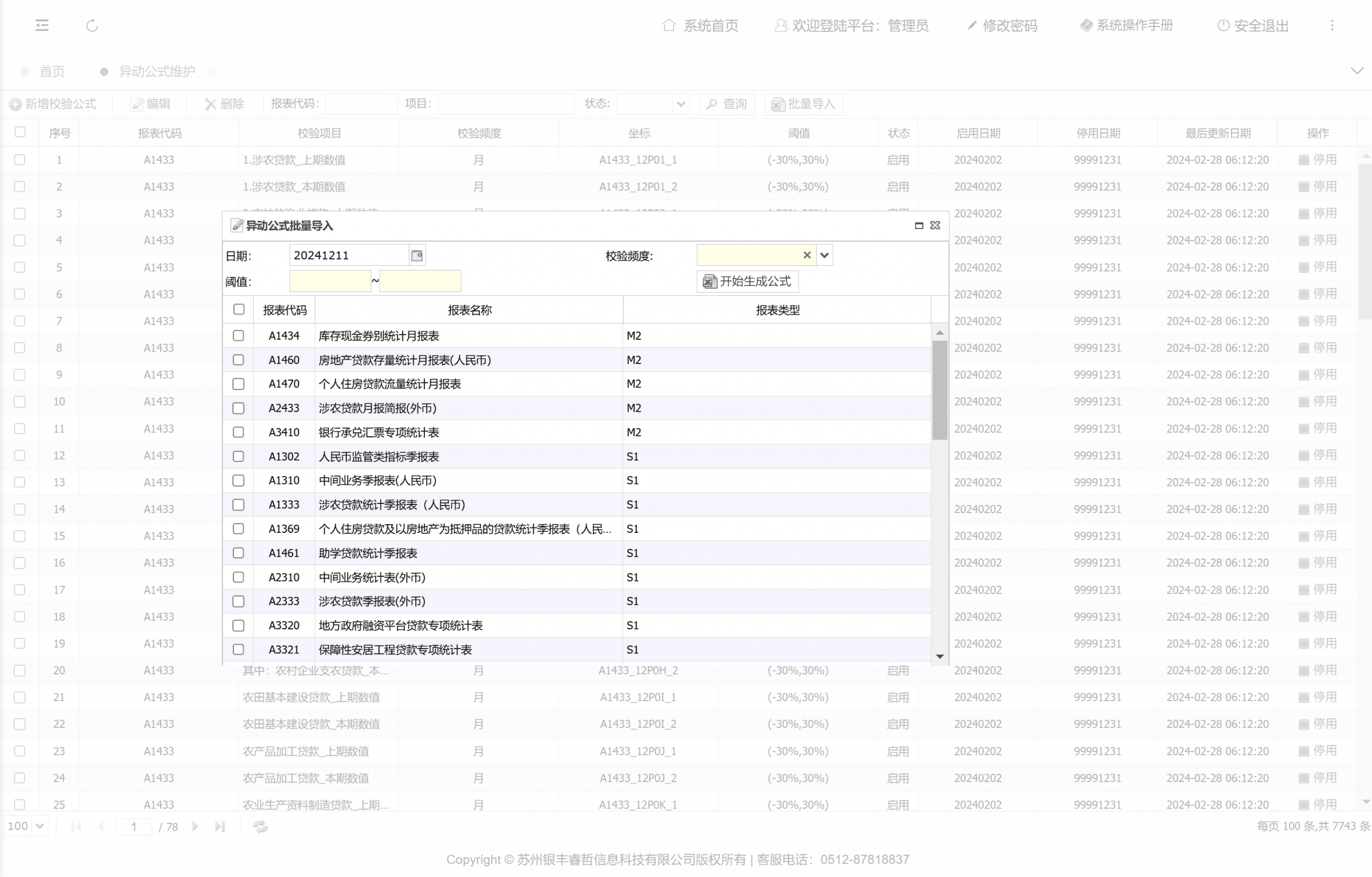 监管报送预审核系统为我公司自主研发,面向监管标准化数据开发的专业数据审核平台。我公司拥有产品的软件著作权,产品已经在国内多个省市,数百家金融机构投入使用。系统⽀持国内所有类型的银行、保险公司、财务公司、消费金融公司等系统,并且7×24小时提供现场及远程技术支持。
