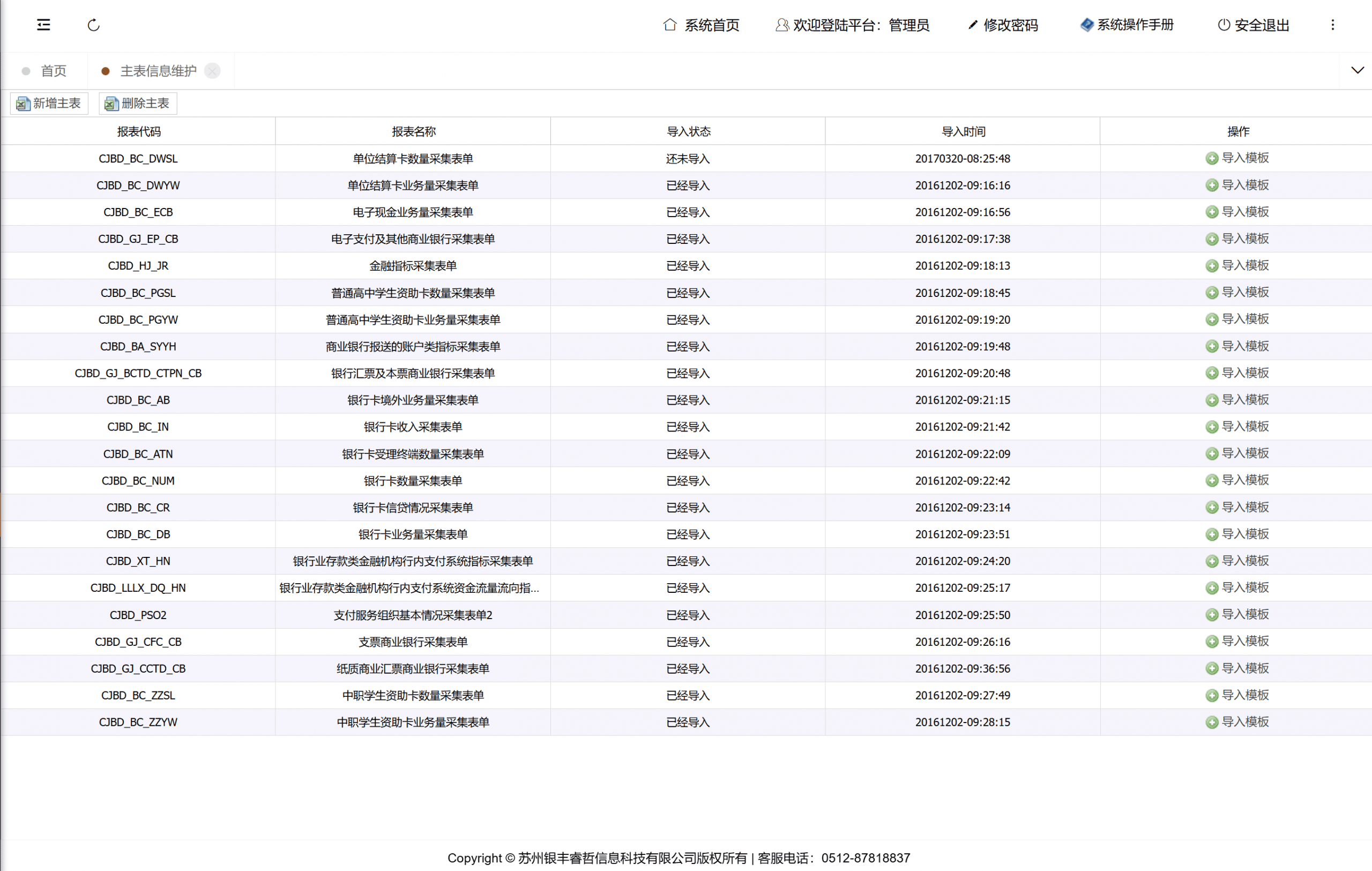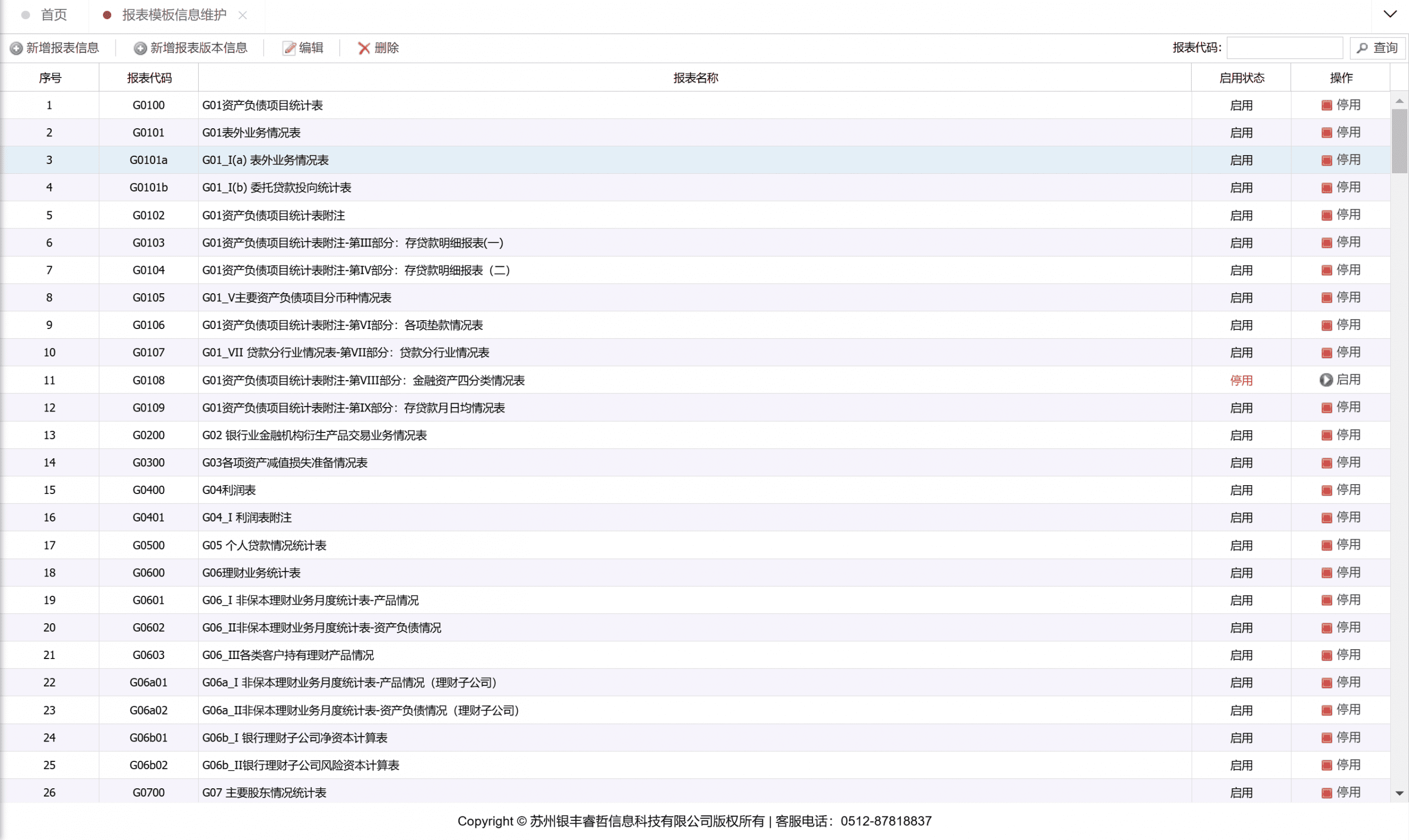 管理报表模板的各项信息,支持用户对报表模板进行新增、修改、删除和查询操作,同时可对报表版本信息进行相应维护。每年最新的报表版本由公司通过统一更新包进行发布和管理。