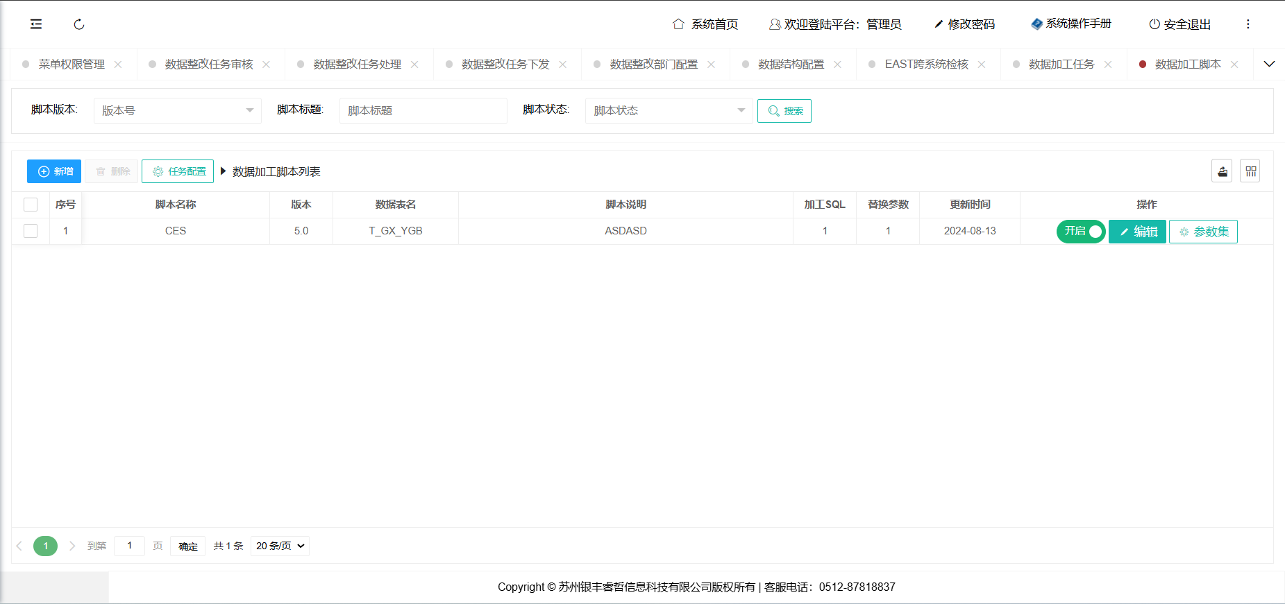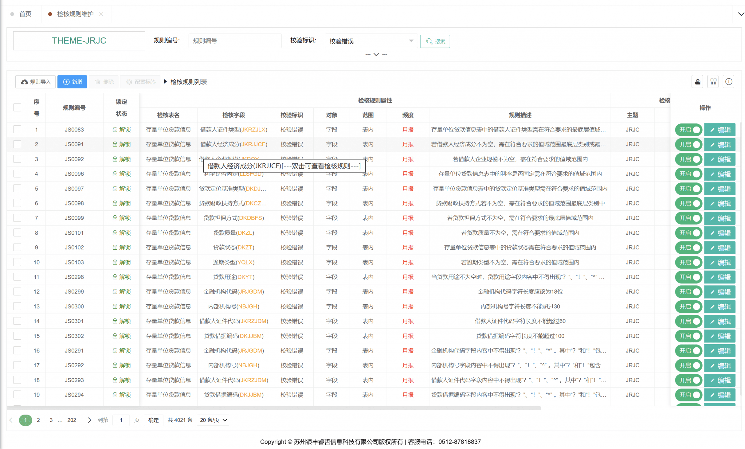 该功能主要是对金融基础数据基础校验的规则的维护工作,可输入不同的条件进行筛选查询,提供新增、编辑、删除和停用功能。