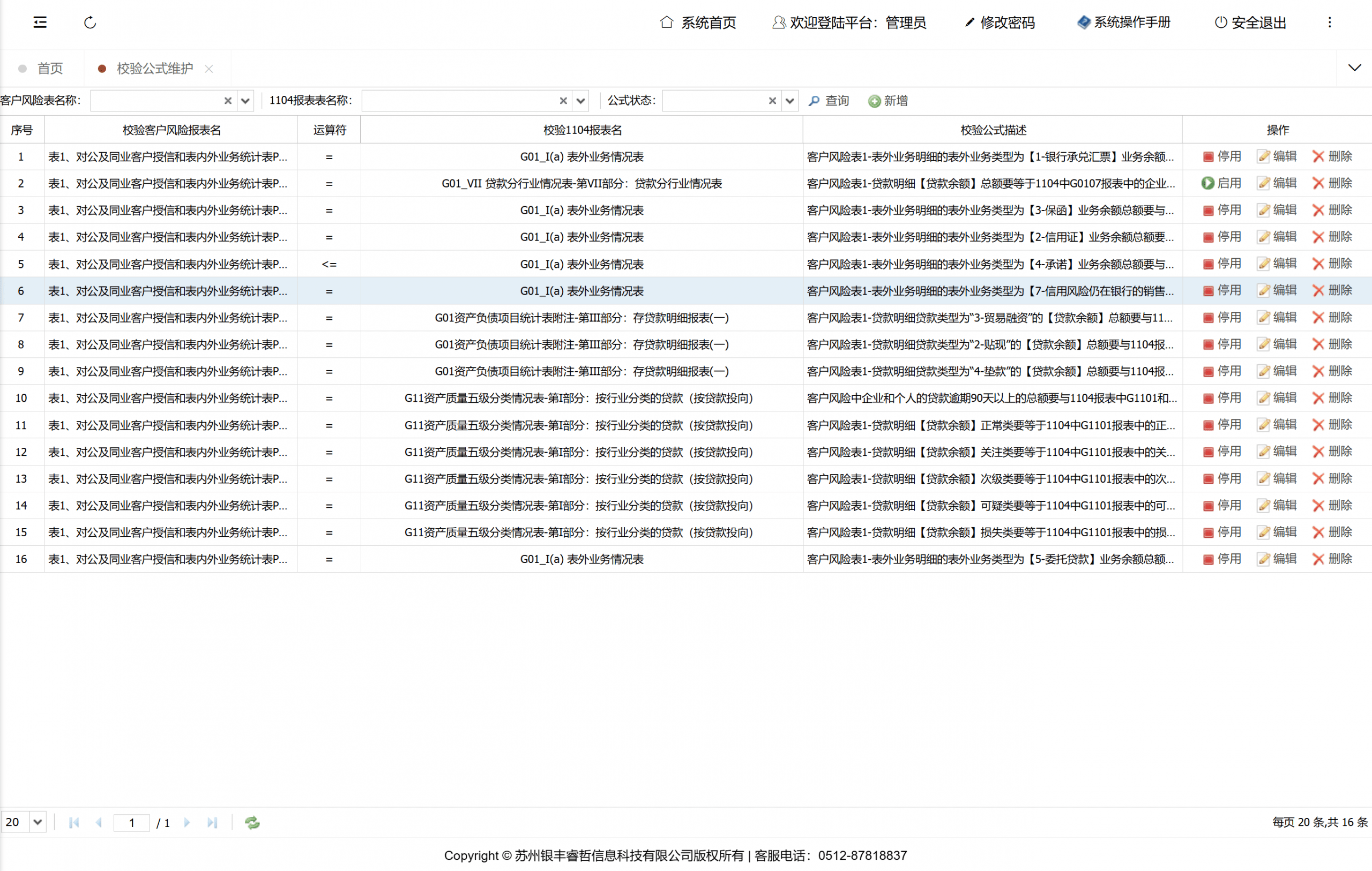管理机构的校验规则,支持用户对公式执行新增、删除、修改、查询及停用操作。
