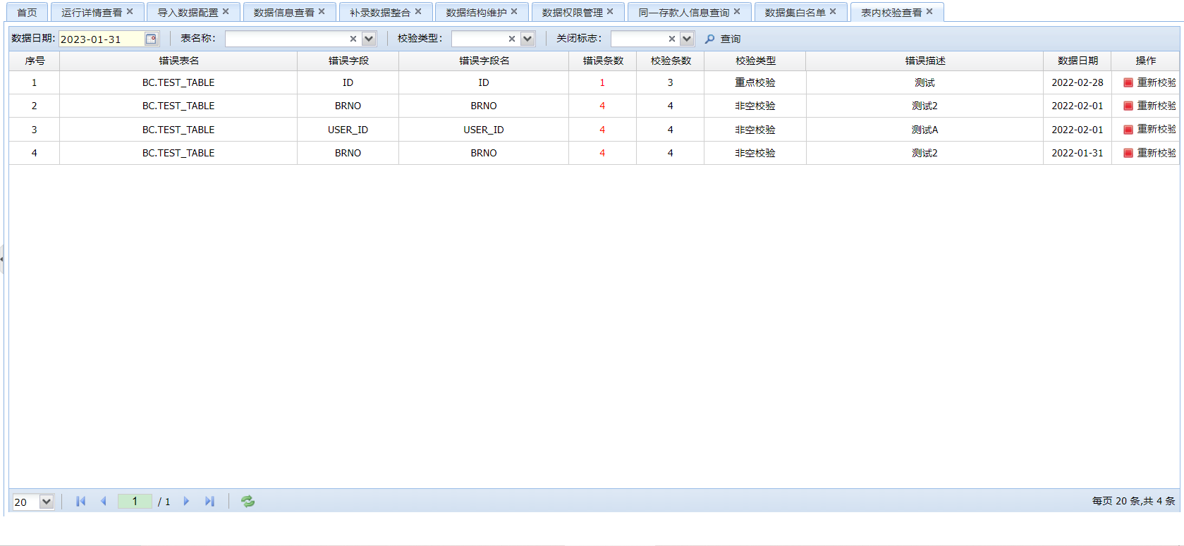 查看针对单个表数据的校验结果,该功能可以清楚的查看问题数据,并且可以对有问题的校验进行重新校验,方便更正校验信息和问题数据。