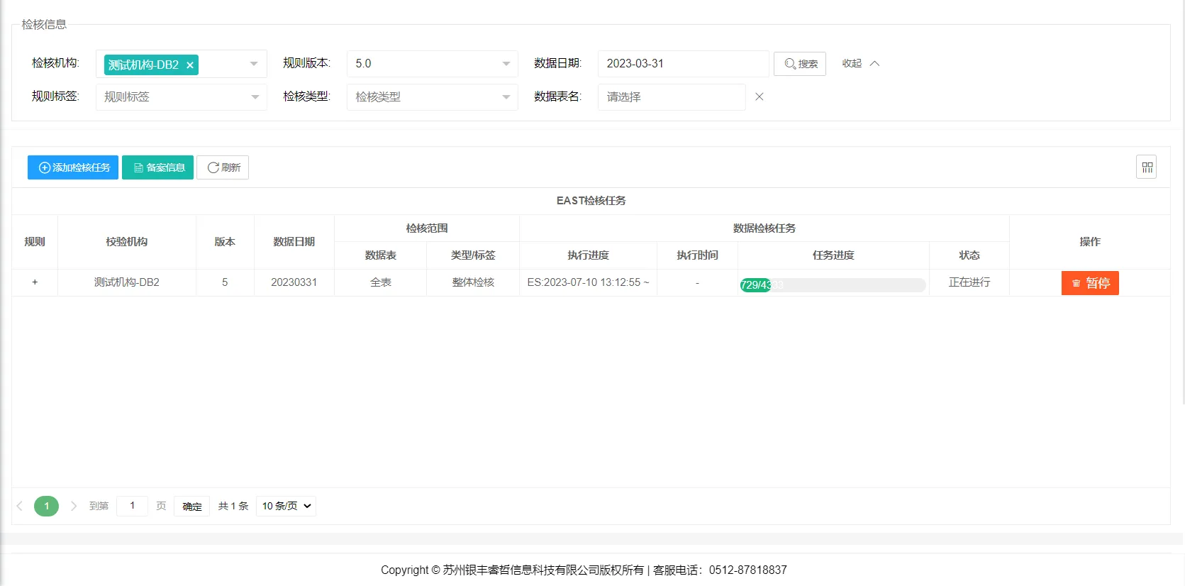 系统支持用户通过多线程方式执行数据校验任务,当用户发起数据校验请求后,系统自动执行数据准备并统计待校验表的数据量,统计完成后,系统基于多线程方式执行校验处理流程,用户可通过页面实时监控校验进度并同步查看当前执行的具体质量规则。
