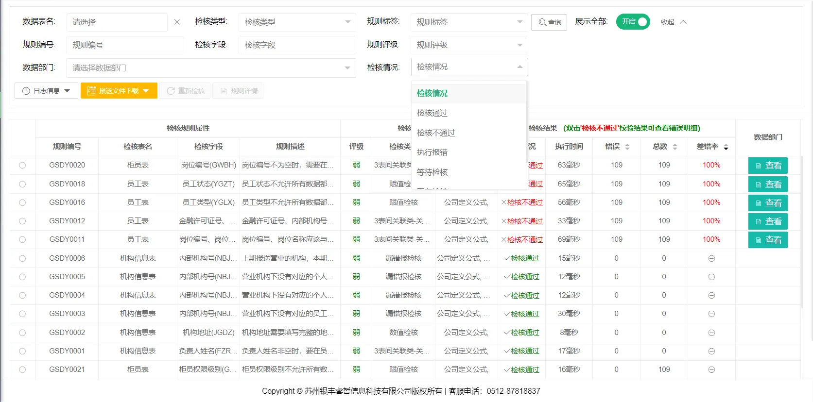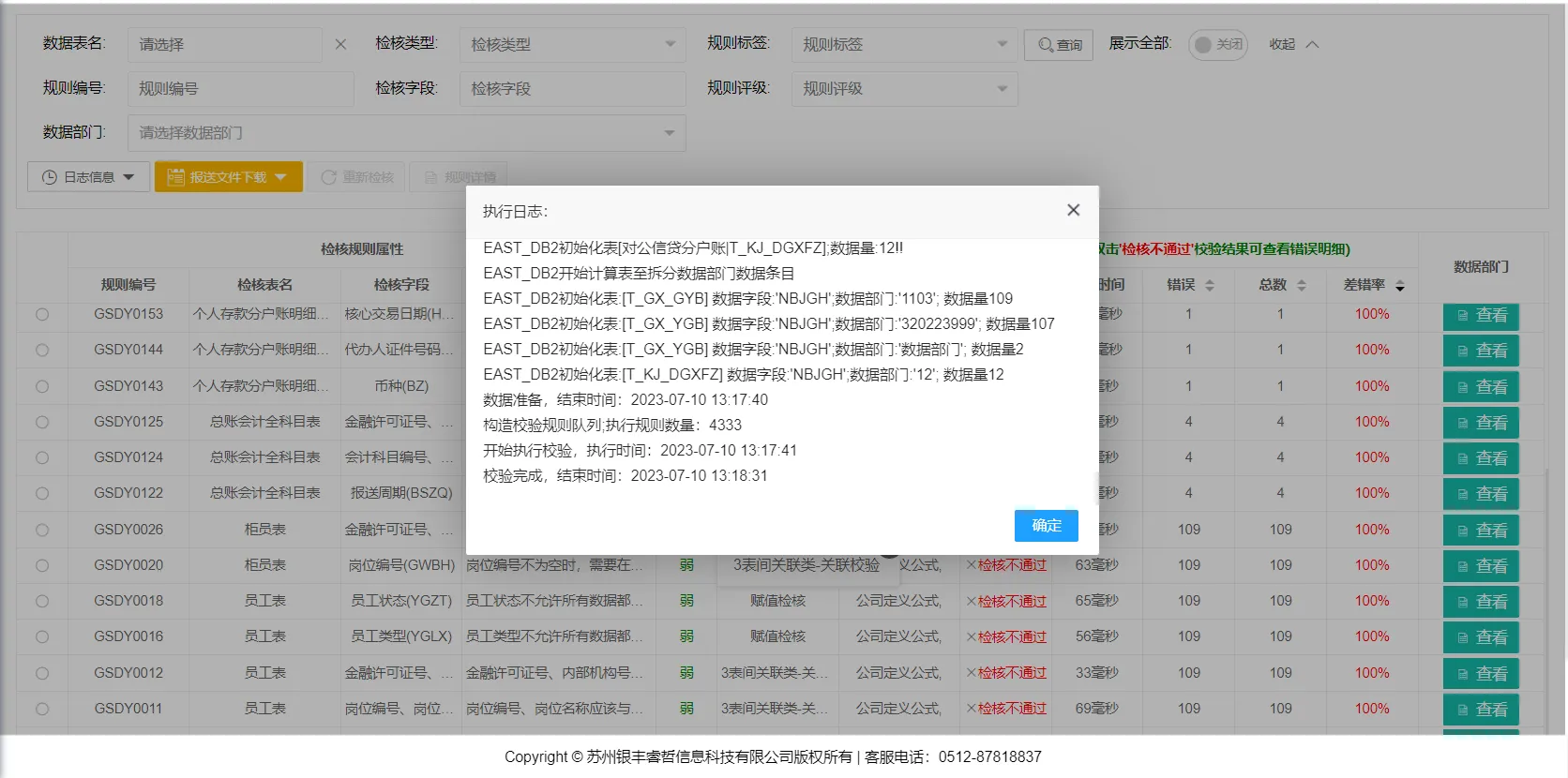 系统支持校验完成后查看错误信息,并提供执行时间、报错详情查询及结果导出功能。