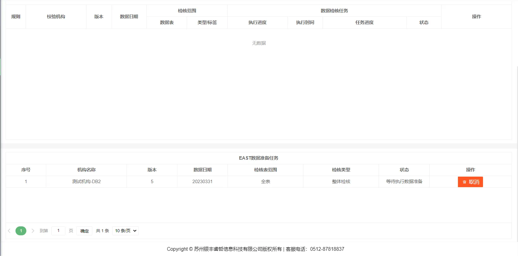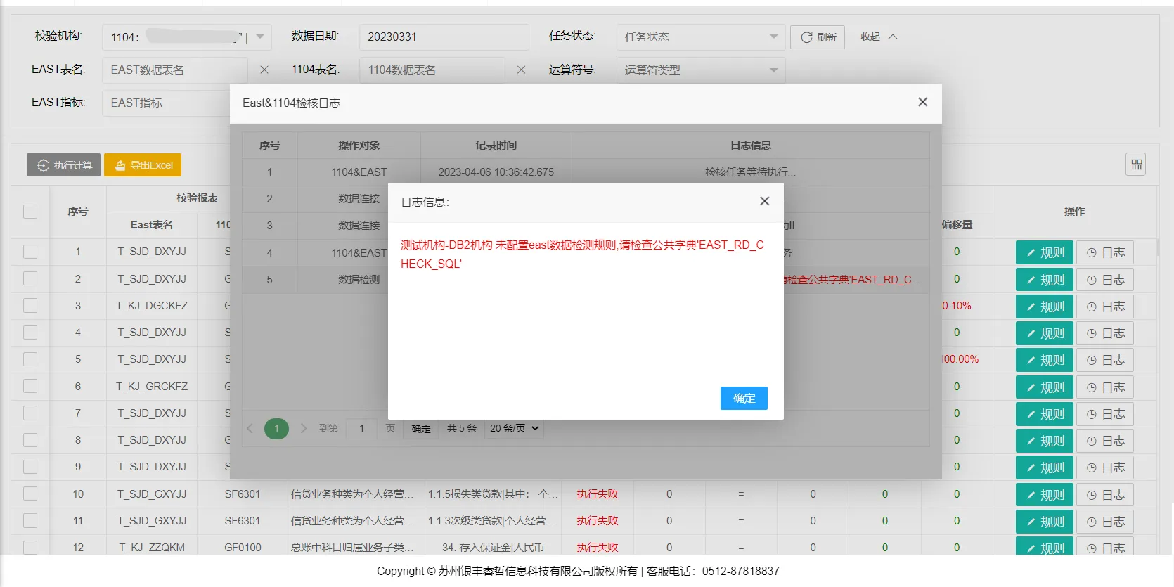 跨系统数据核对基于预配置的1104与EAST质量规则执行跨系统表间校验,校验结果持久化存储至数据库,支持用户以EAST及1104报表名称为筛选条件进行结果查询。