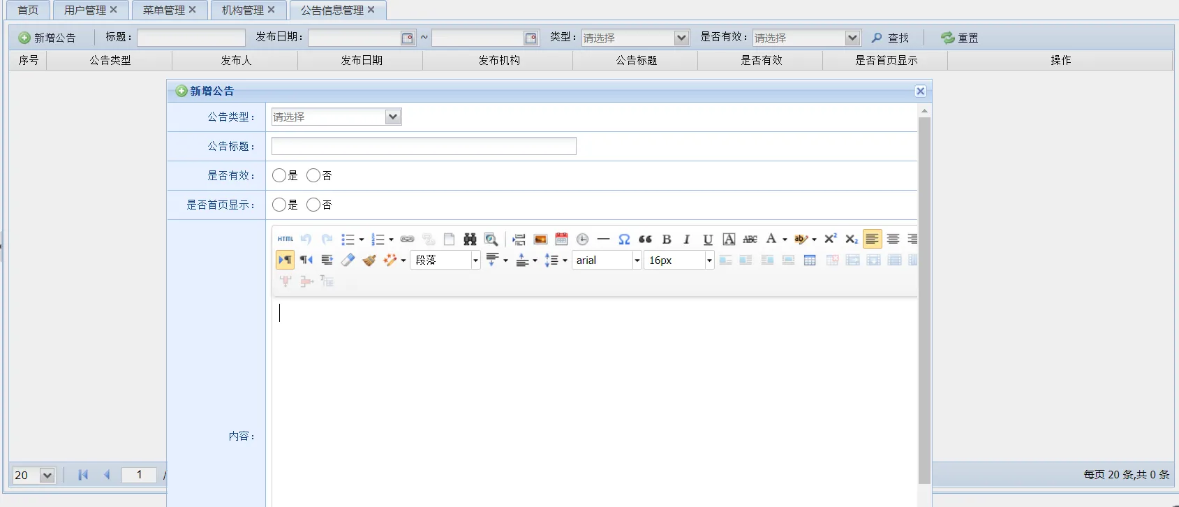 系统支持可视化维护公告信息,包括公告标题和内容信息。