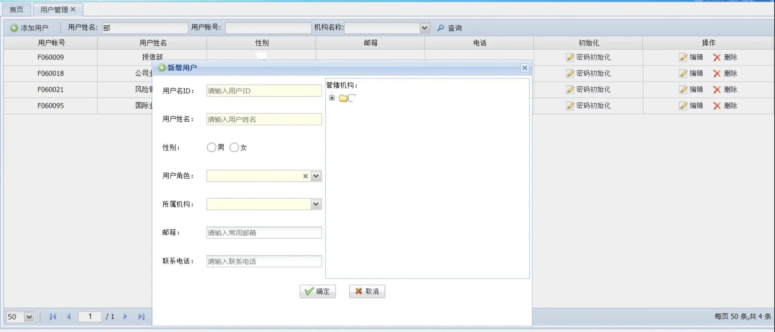 系统支持可视化维护用户信息,其中包括用户名称、用户姓名、用户有效期、用户拥有角色、用户管辖机构等信息。