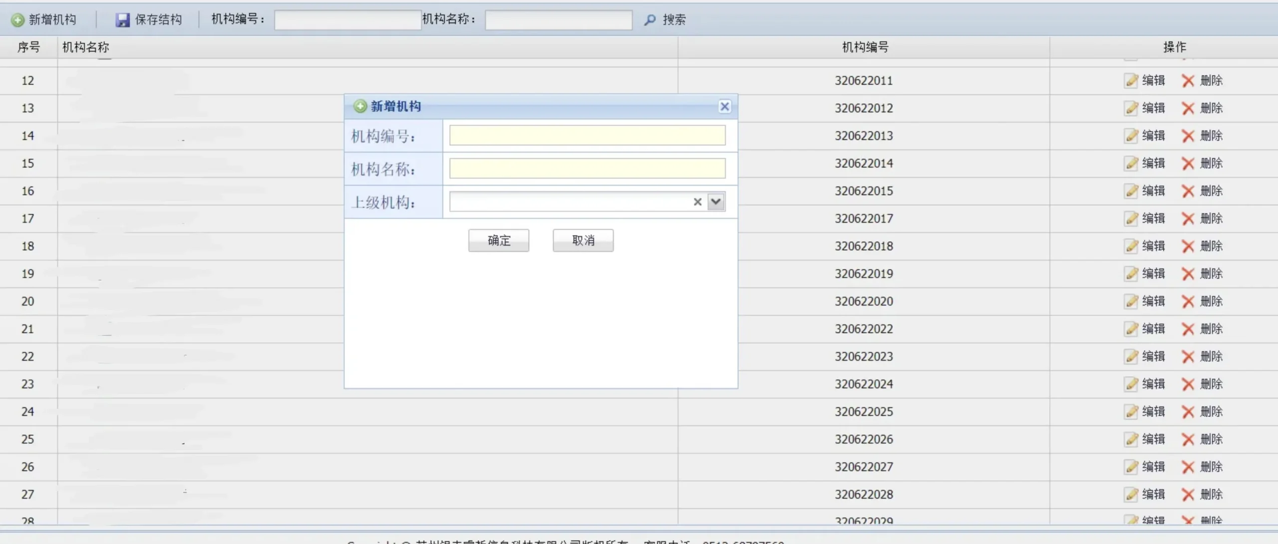系统支持可视化维护机构信息,其中包括机构编号、机构名称、机构类型、上级机构等信息。