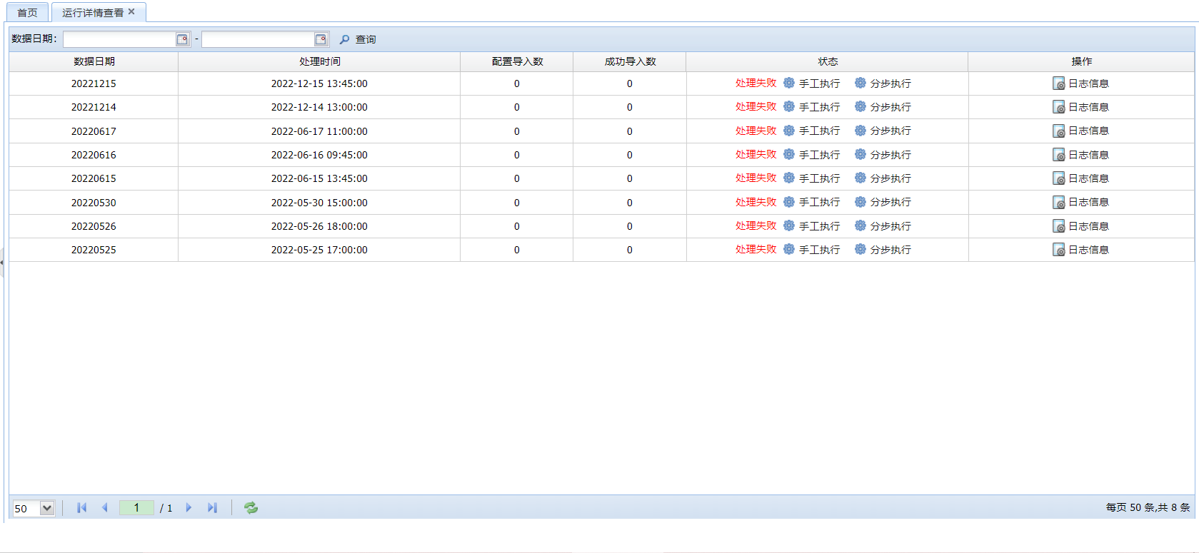 该功能模块用于查看数据导入程序的运行情况,并对运行出问题的导入程序进行手动执行或者分步骤执行。