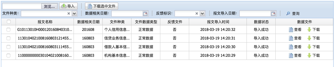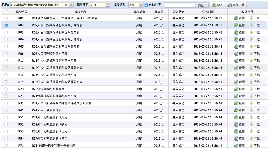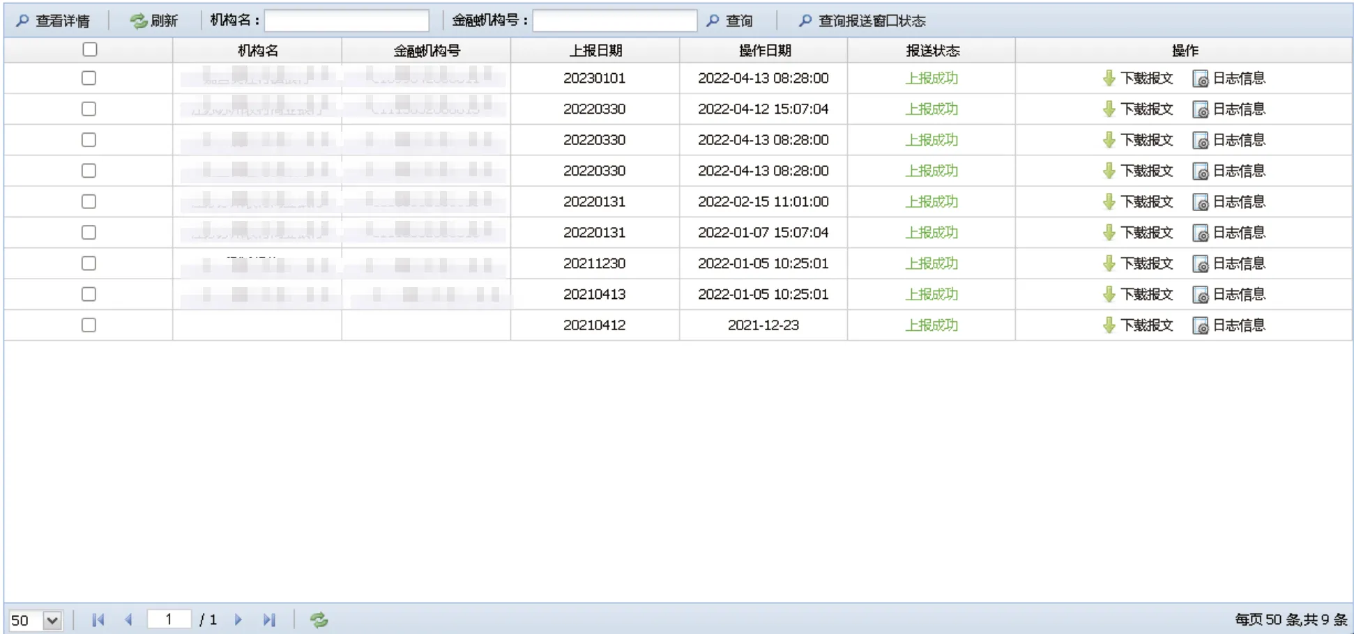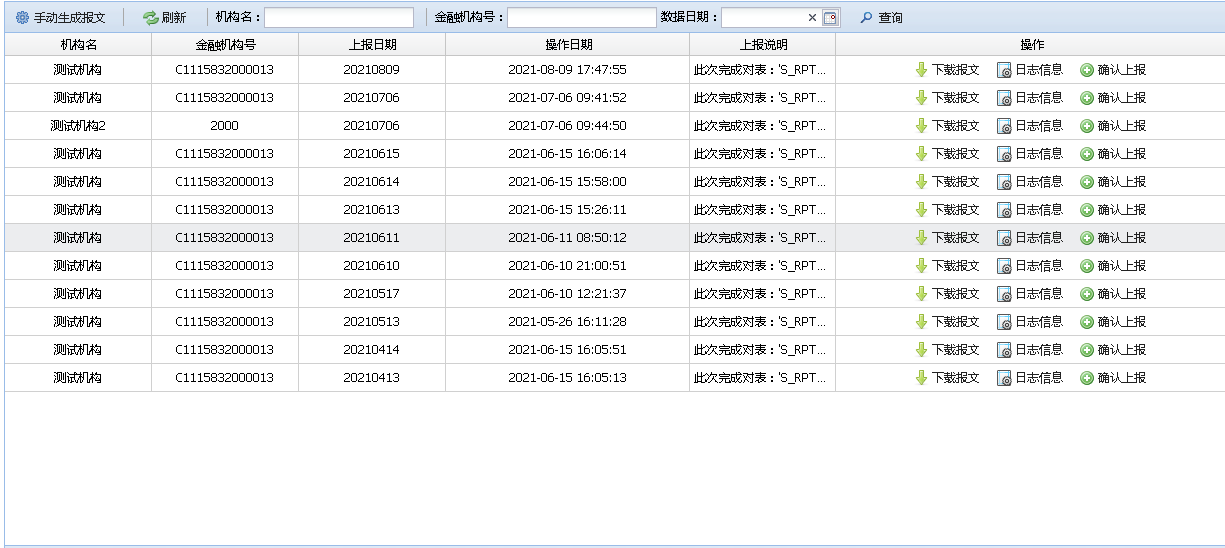 展示上报银行自动上报任务列表信息,可以下载上报的报文、查看上报的日志信息以及上报状态。