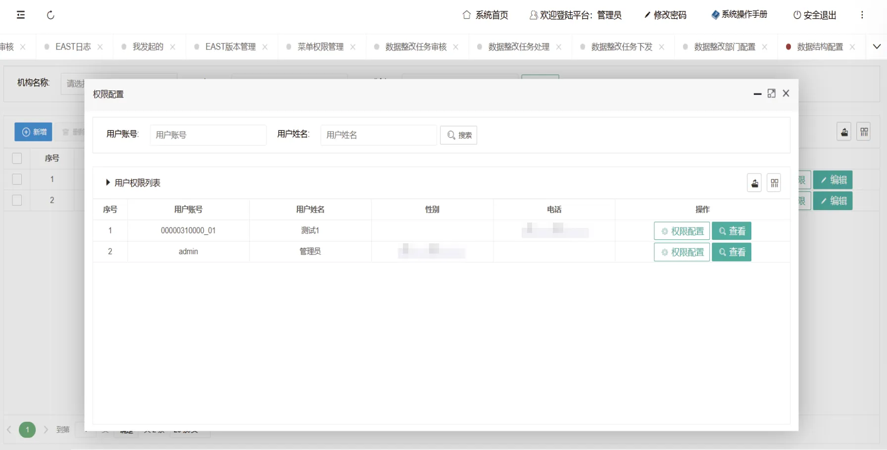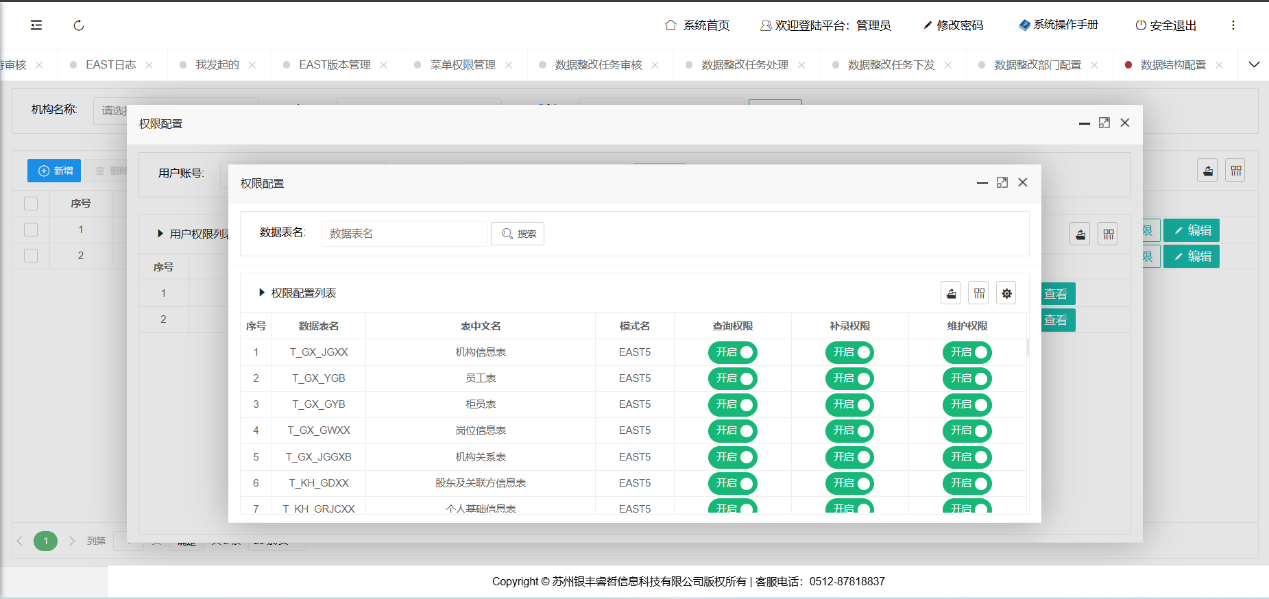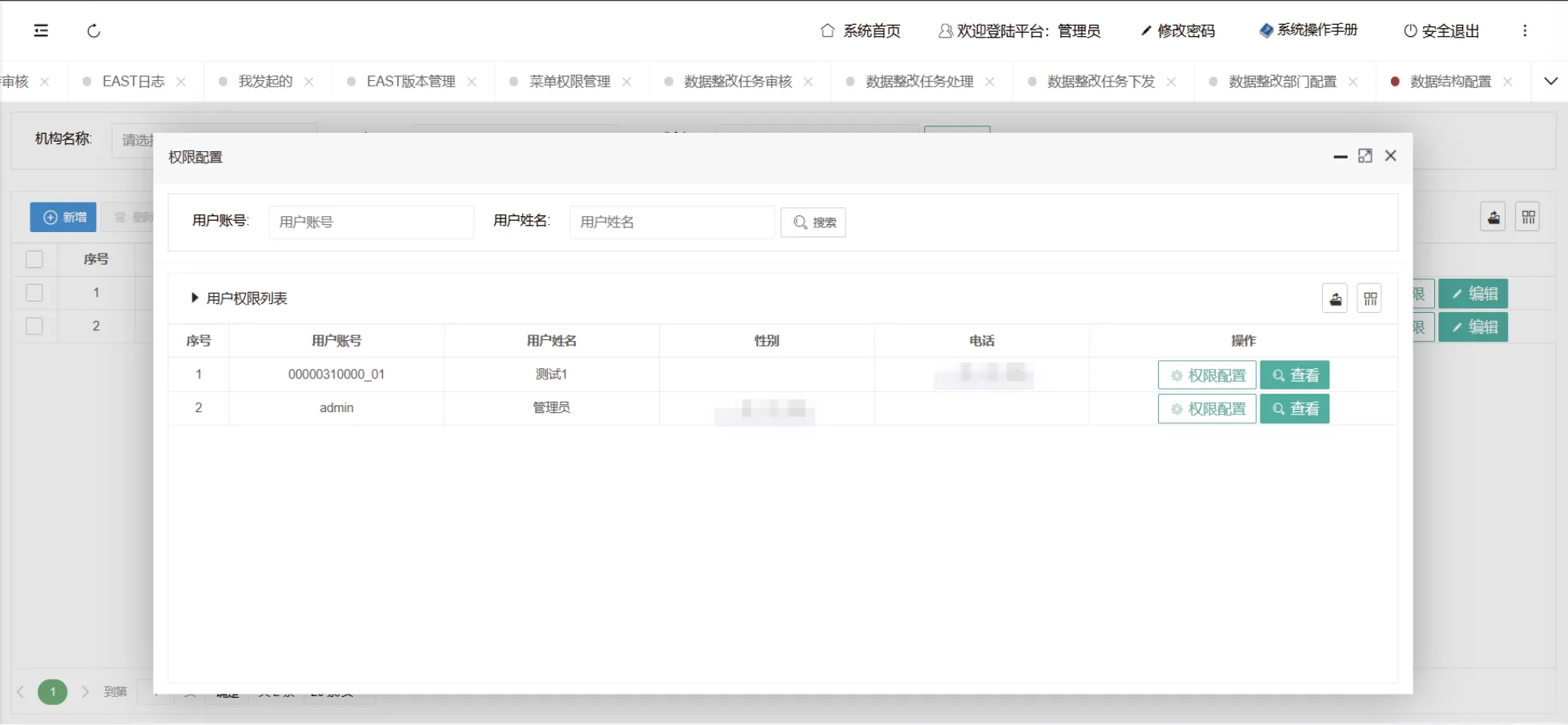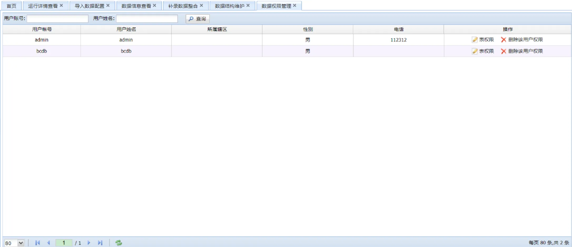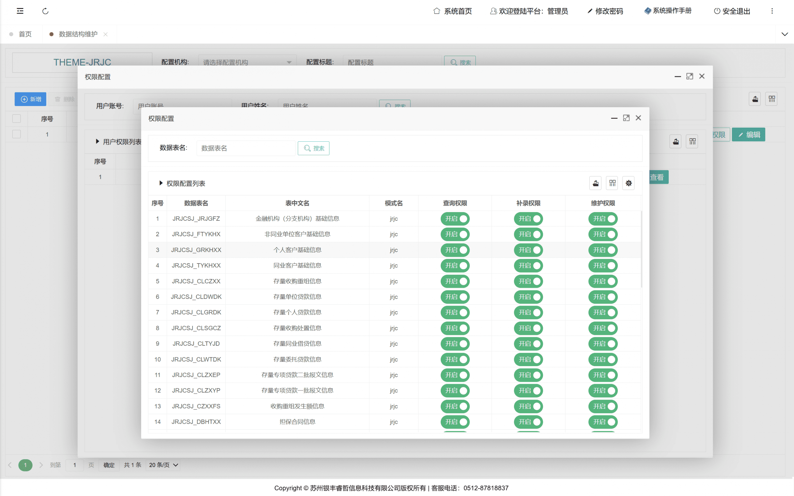 管理员设置用户对于需要管理数据的表格的相关权限信息,包括查看数据等权限。
