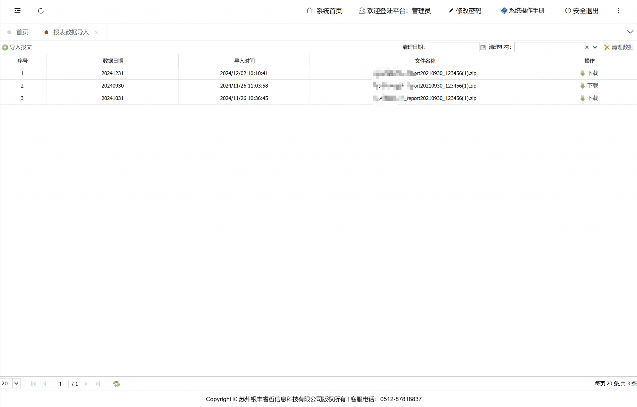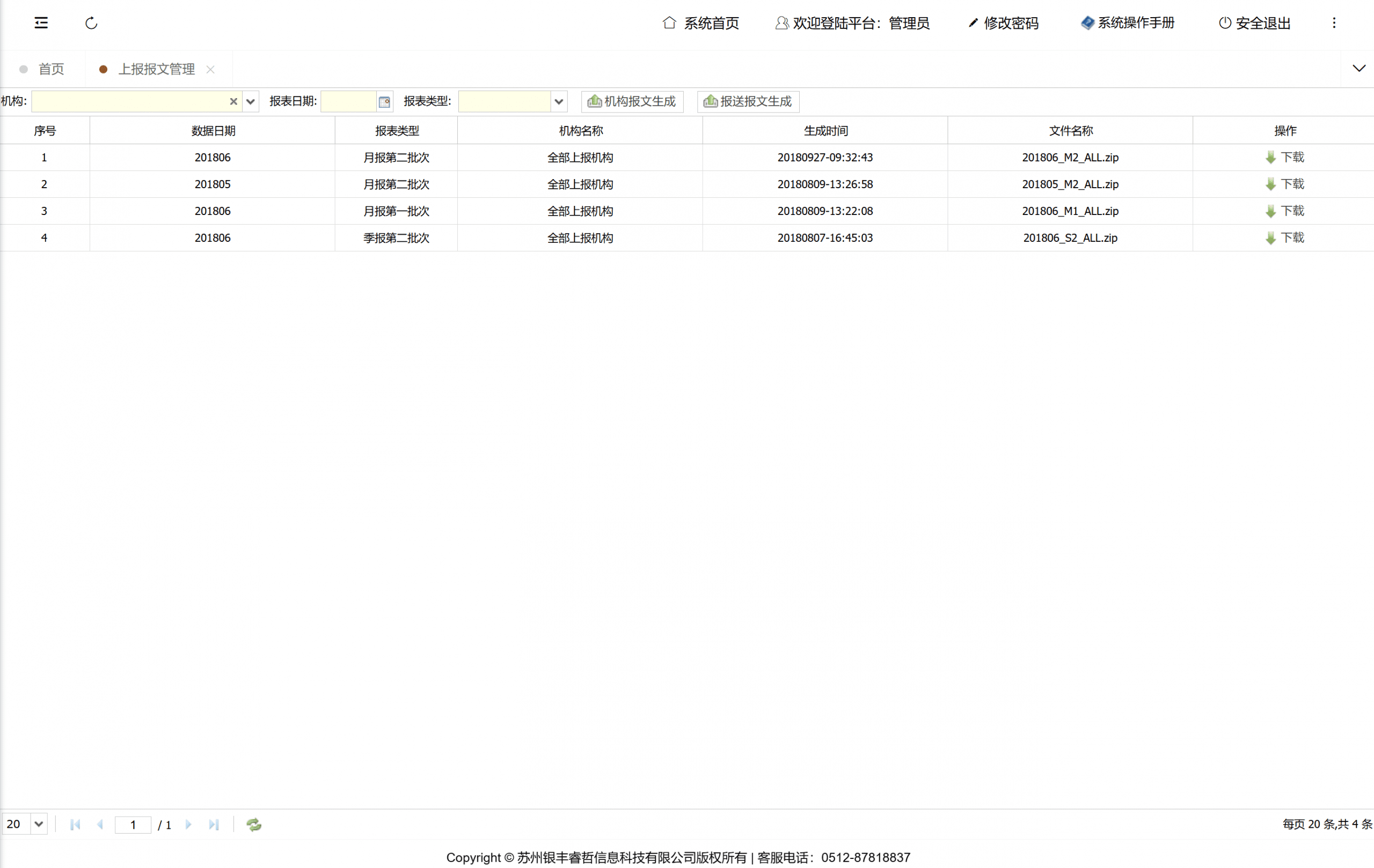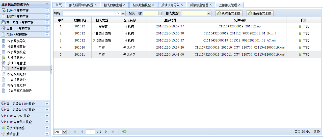 展示手动生成报文的列表,可以下载手动生成的报文以及将该日期的上报记录推送到报文上报记录表中。