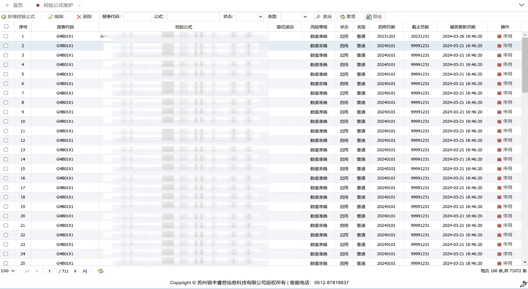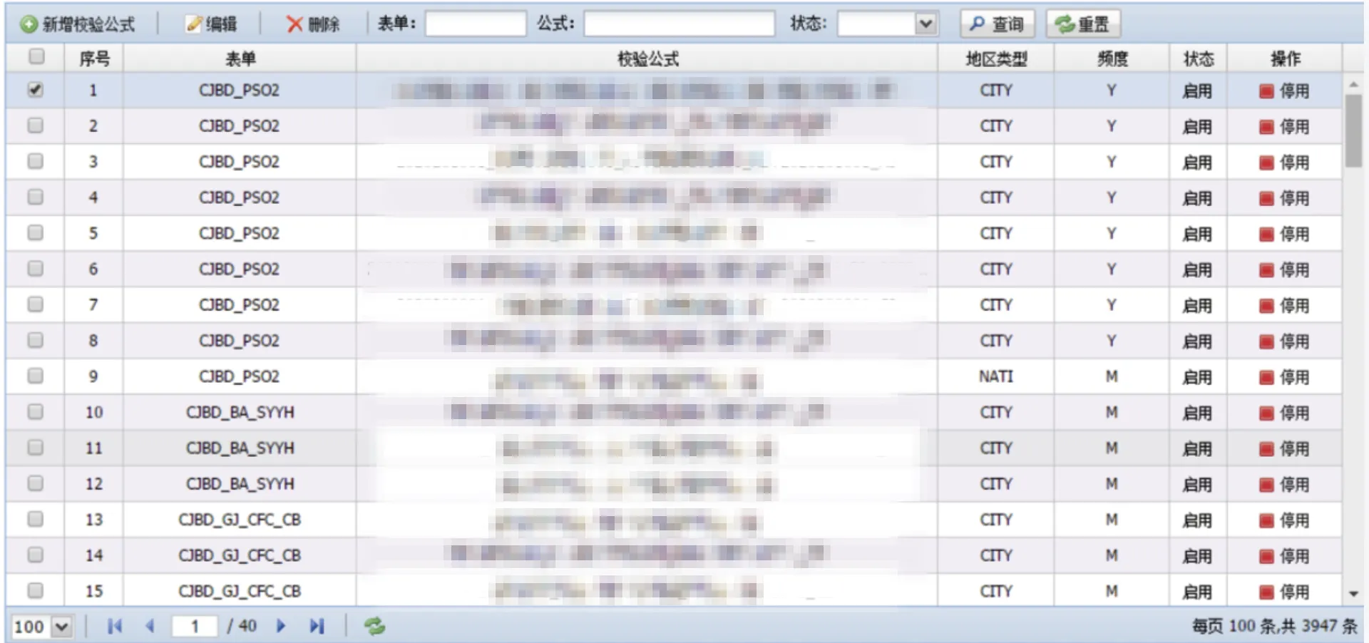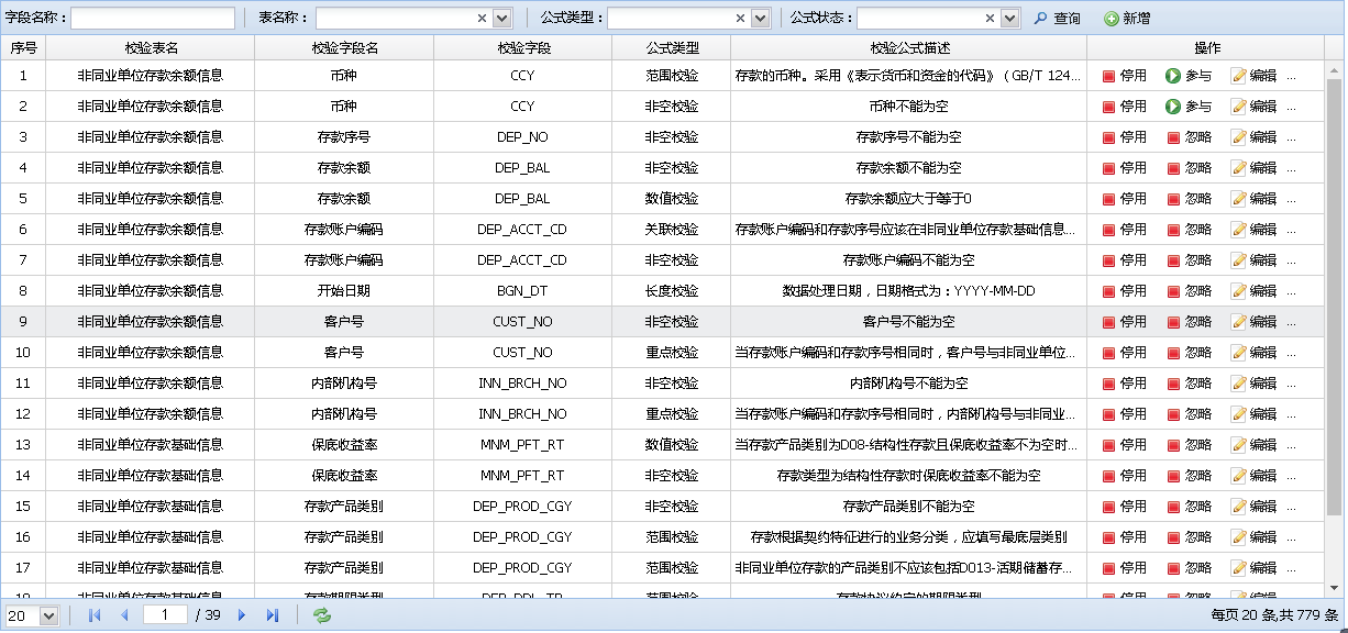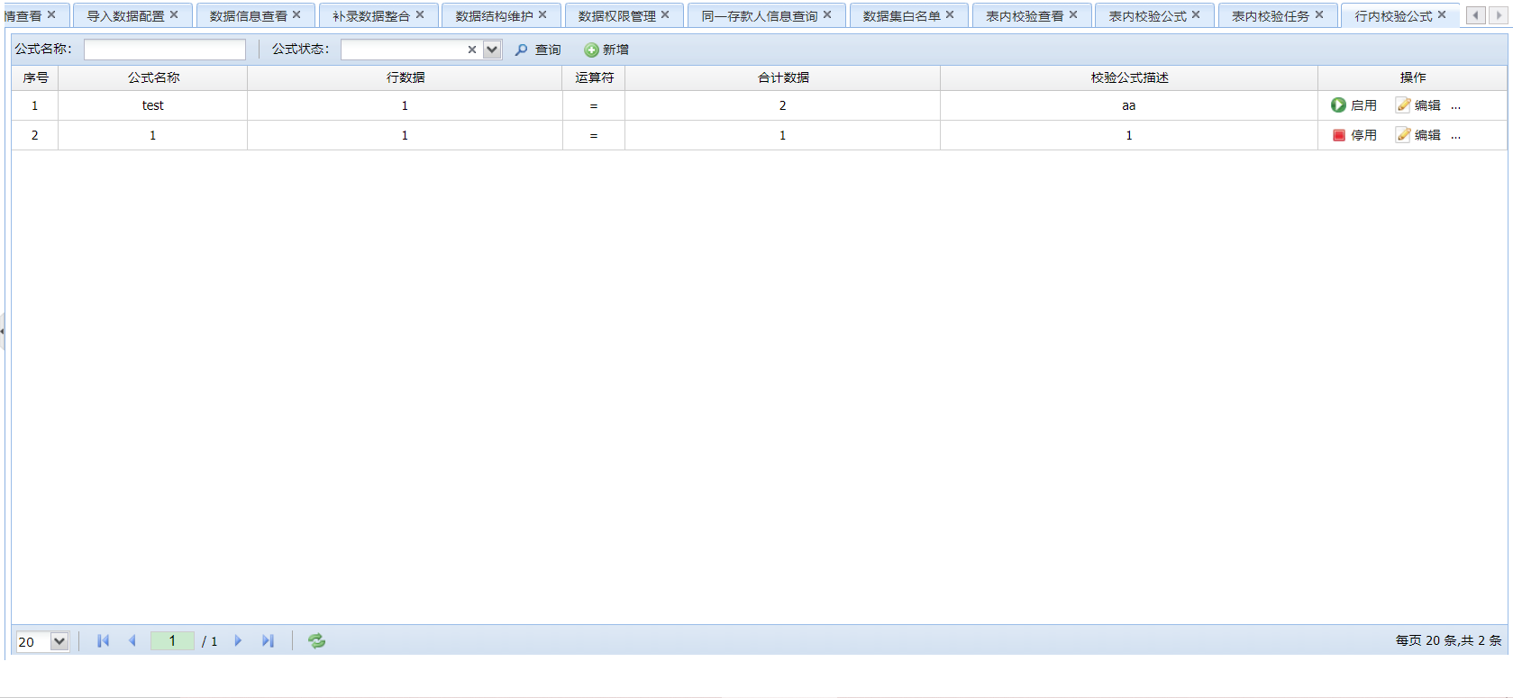 管理机构的校验规则,支持用户对公式执行新增、删除、修改、查询及停用操作。