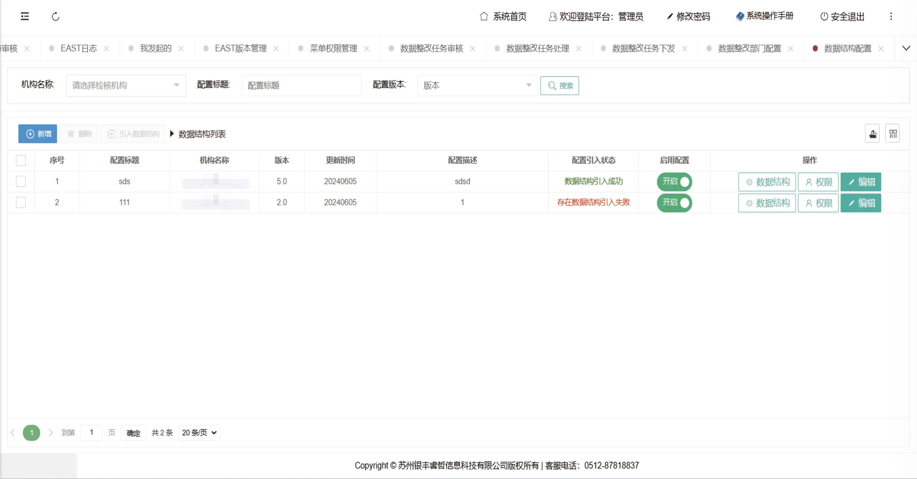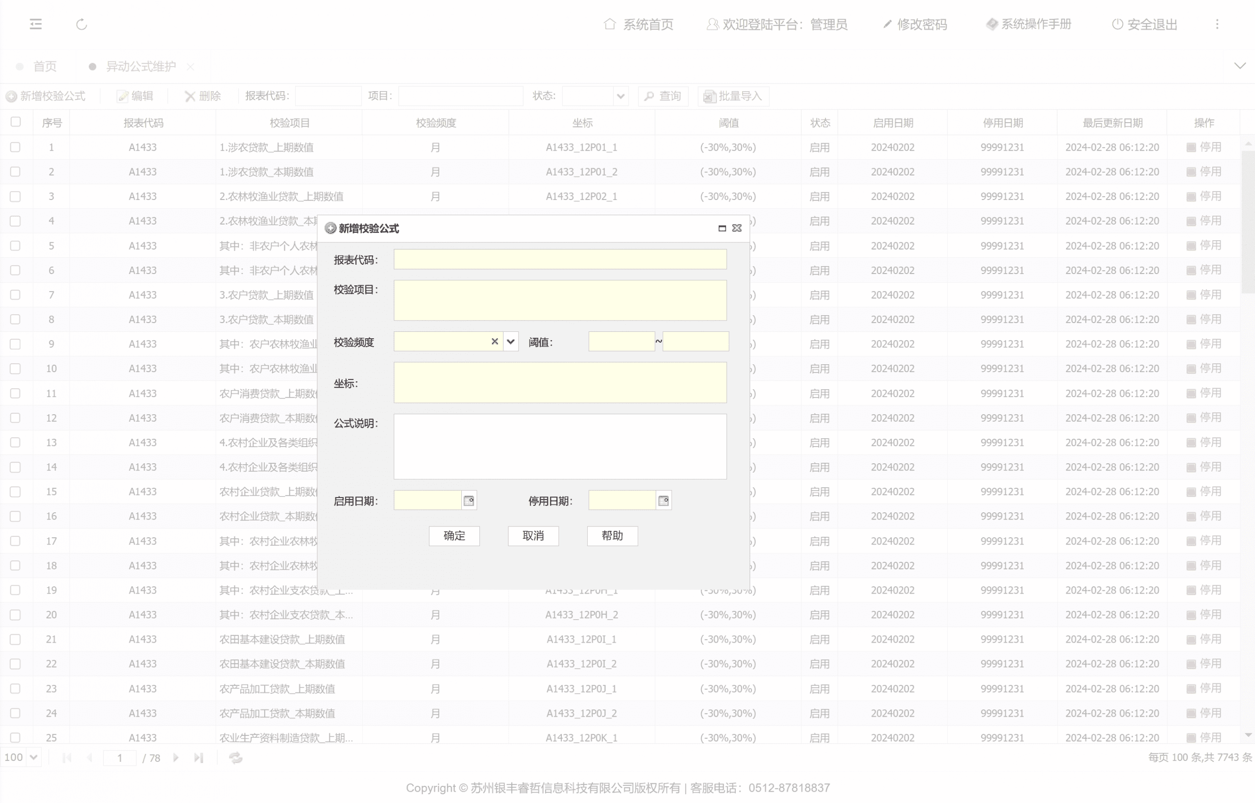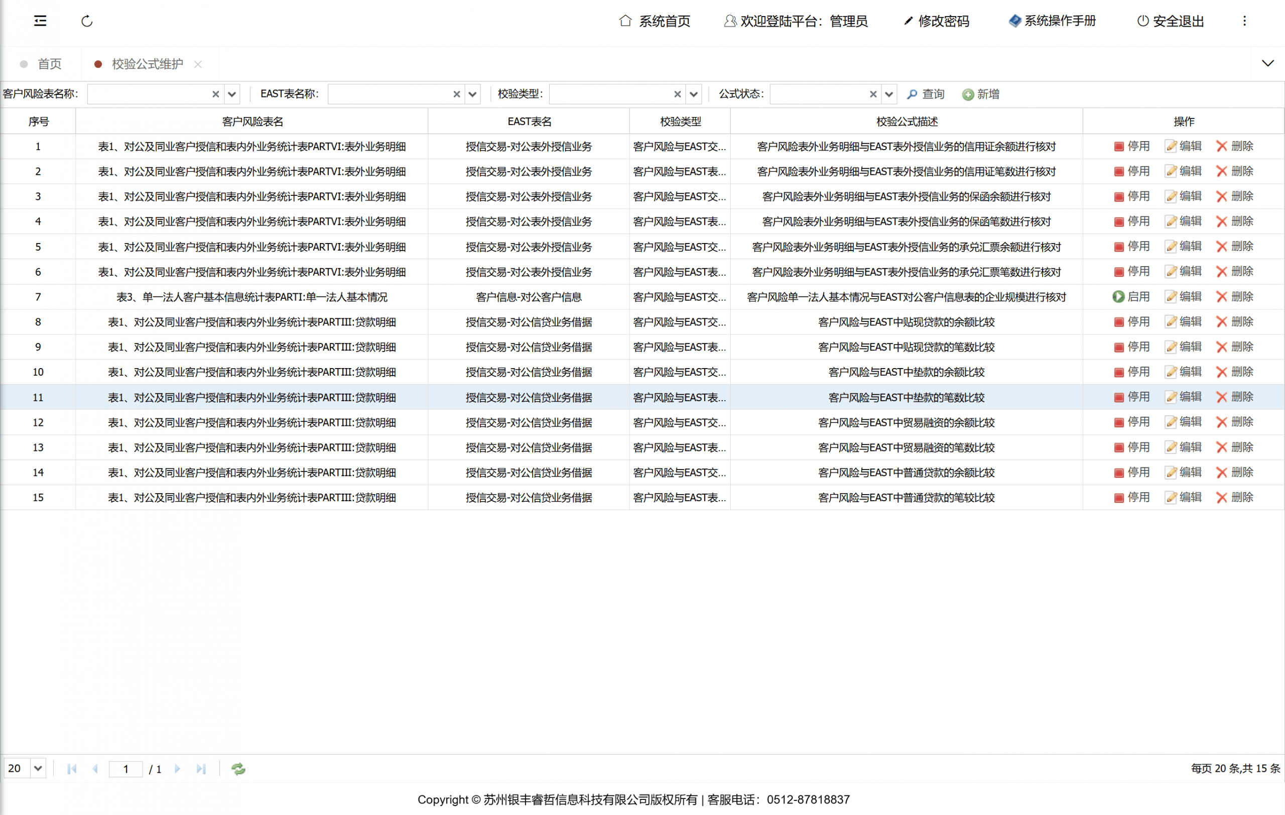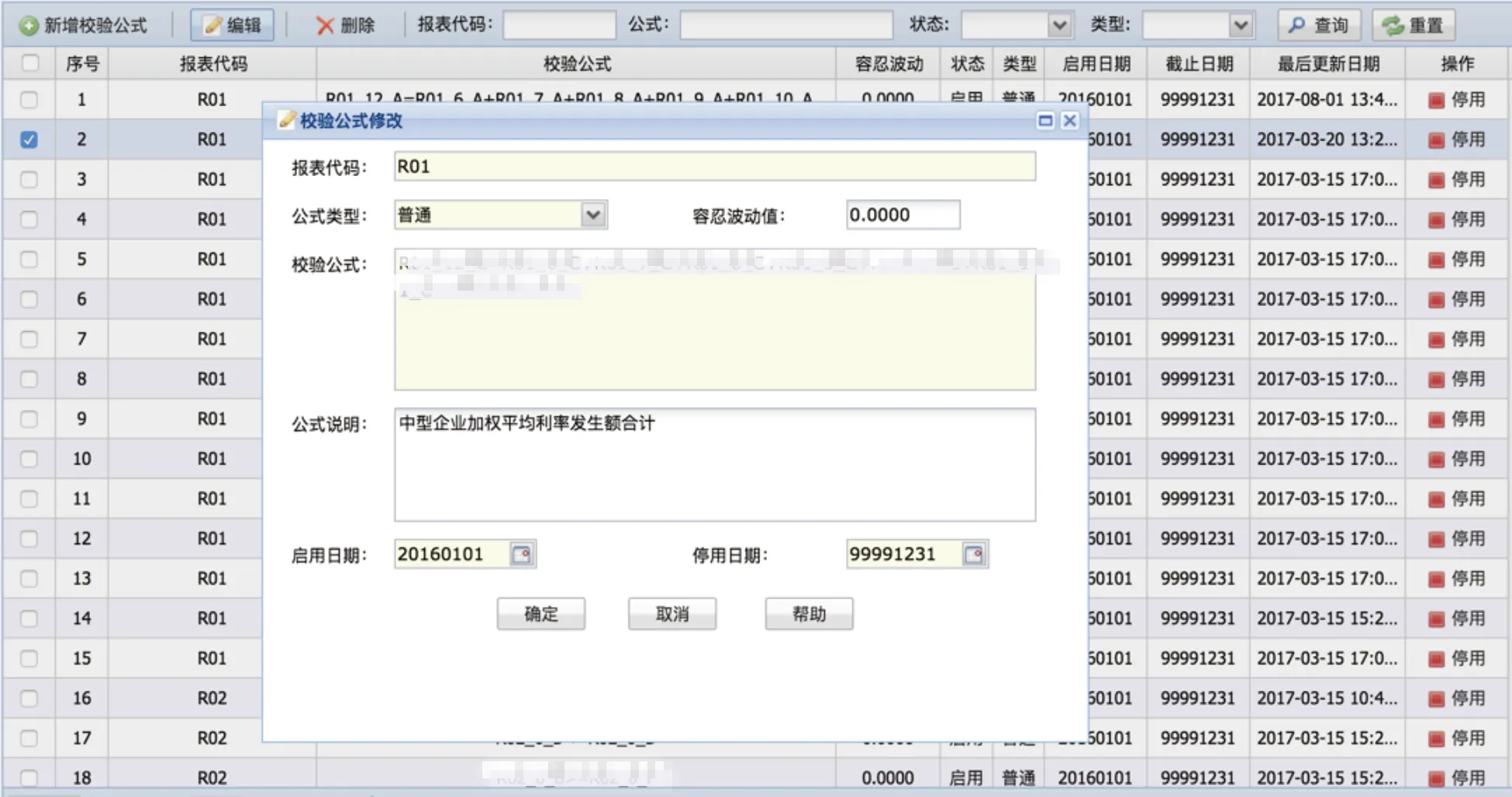 管理机构的校验规则,支持用户对公式执行新增、删除、修改、查询及停用操作。