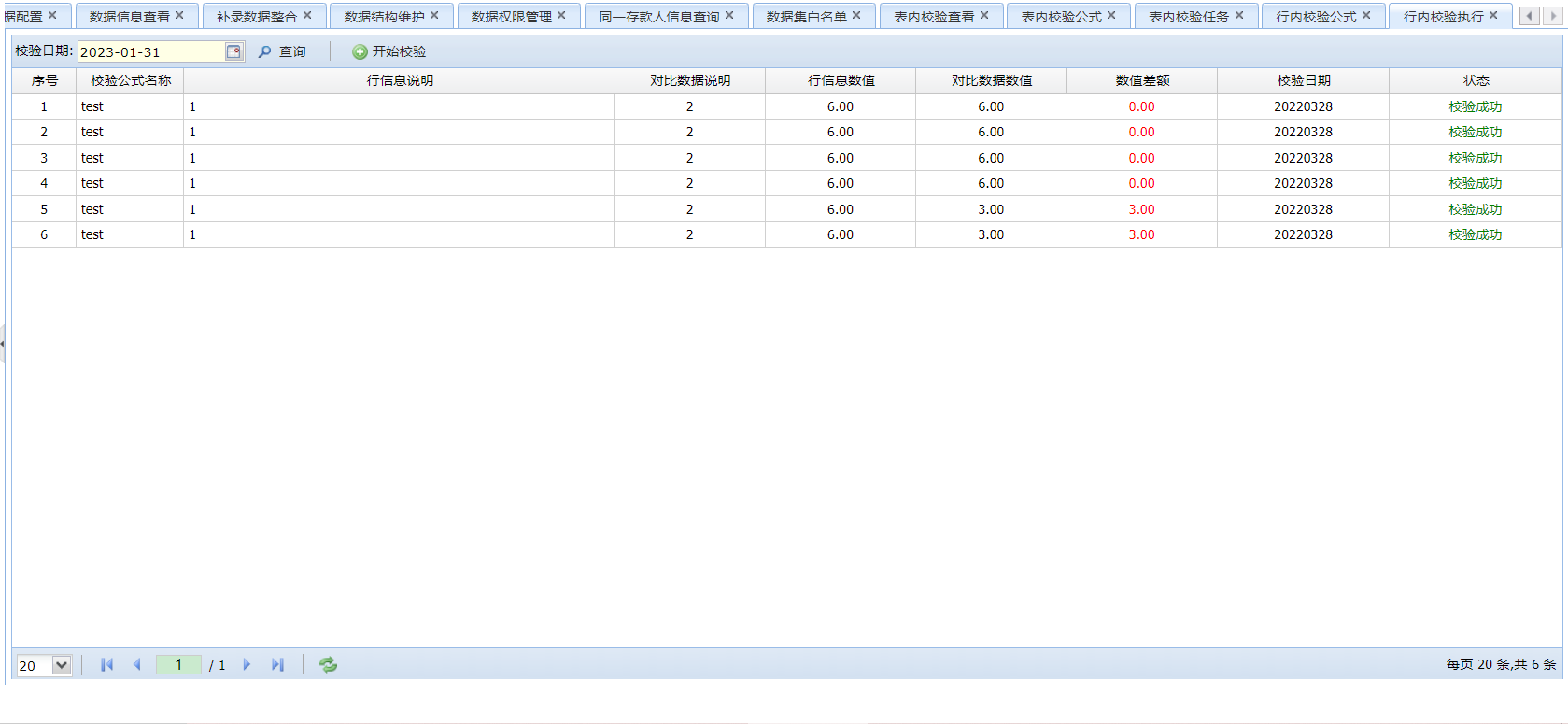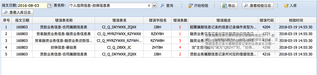 查看针对单个表数据的校验结果,该功能可以清楚的查看问题数据,并且可以对有问题的校验进行重新校验,方便更正校验信息和问题数据。