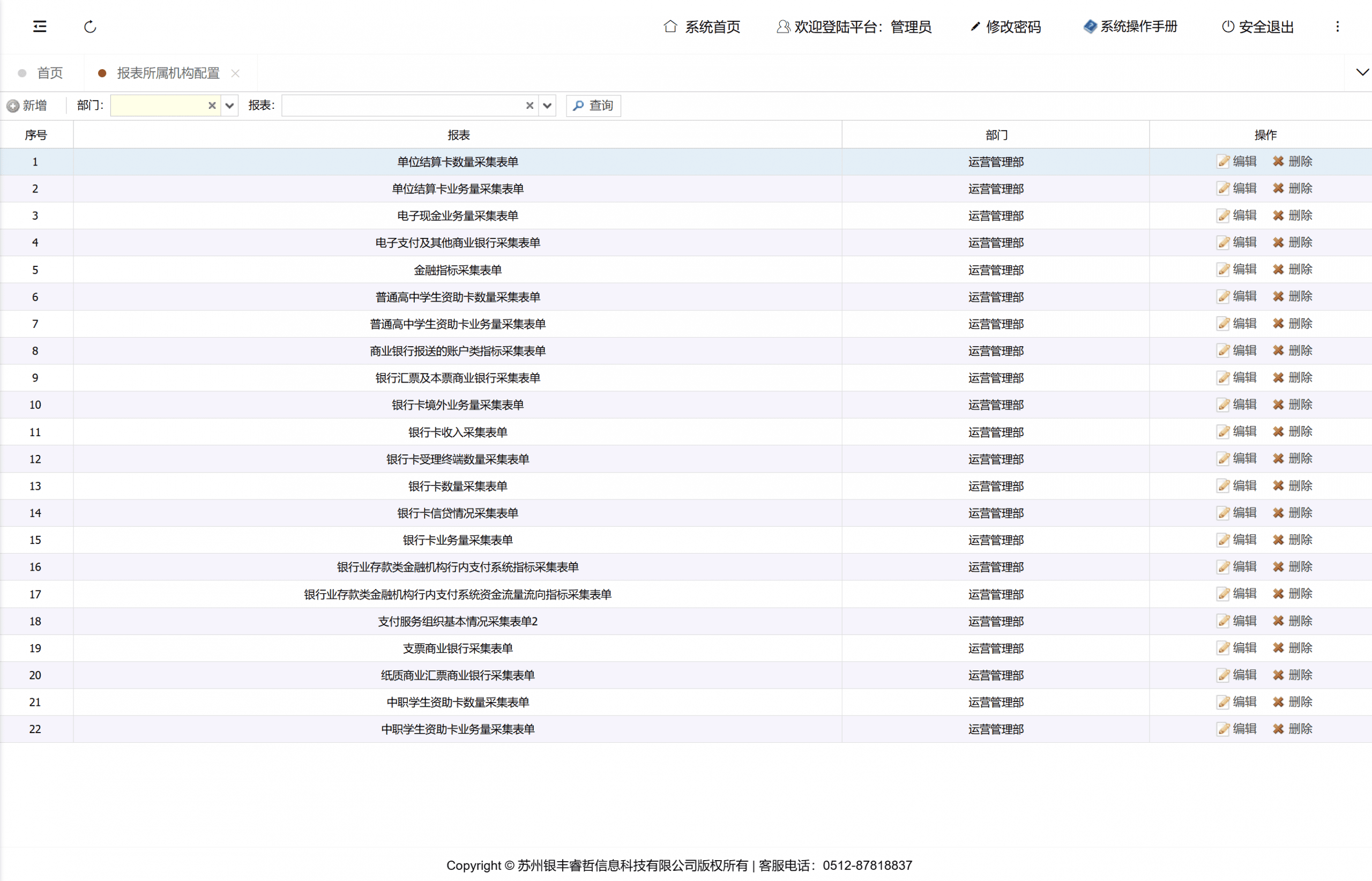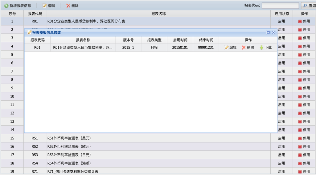 管理报表模板的各项信息,支持用户对报表模板进行新增、修改、删除和查询操作,同时可对报表版本信息进行相应维护。每年最新的报表版本由公司通过统一更新包进行发布和管理。