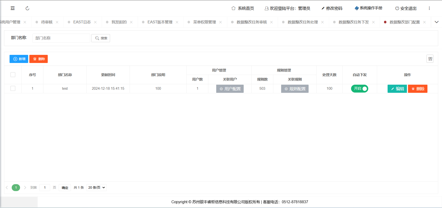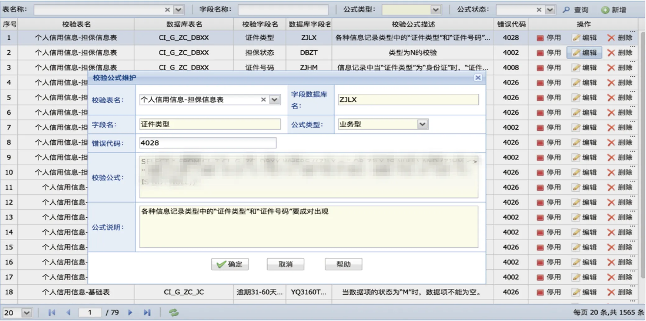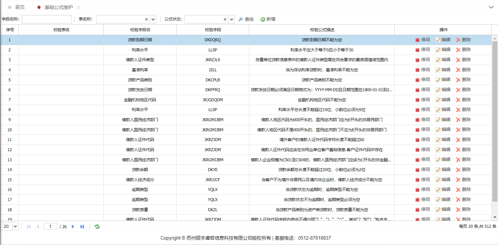 该功能主要是对金融基础数据基础校验的规则的维护工作,可输入不同的条件进行筛选查询,提供新增、编辑、删除和停用功能。
