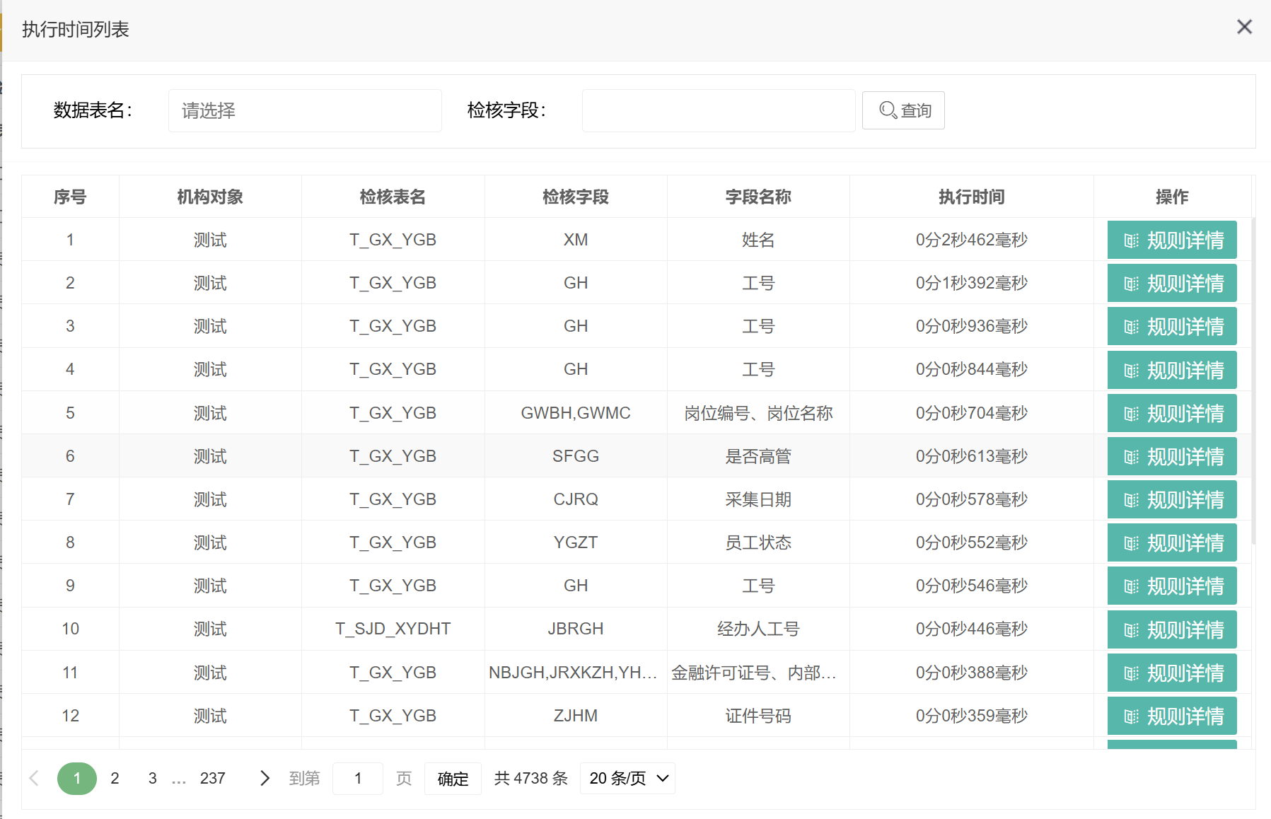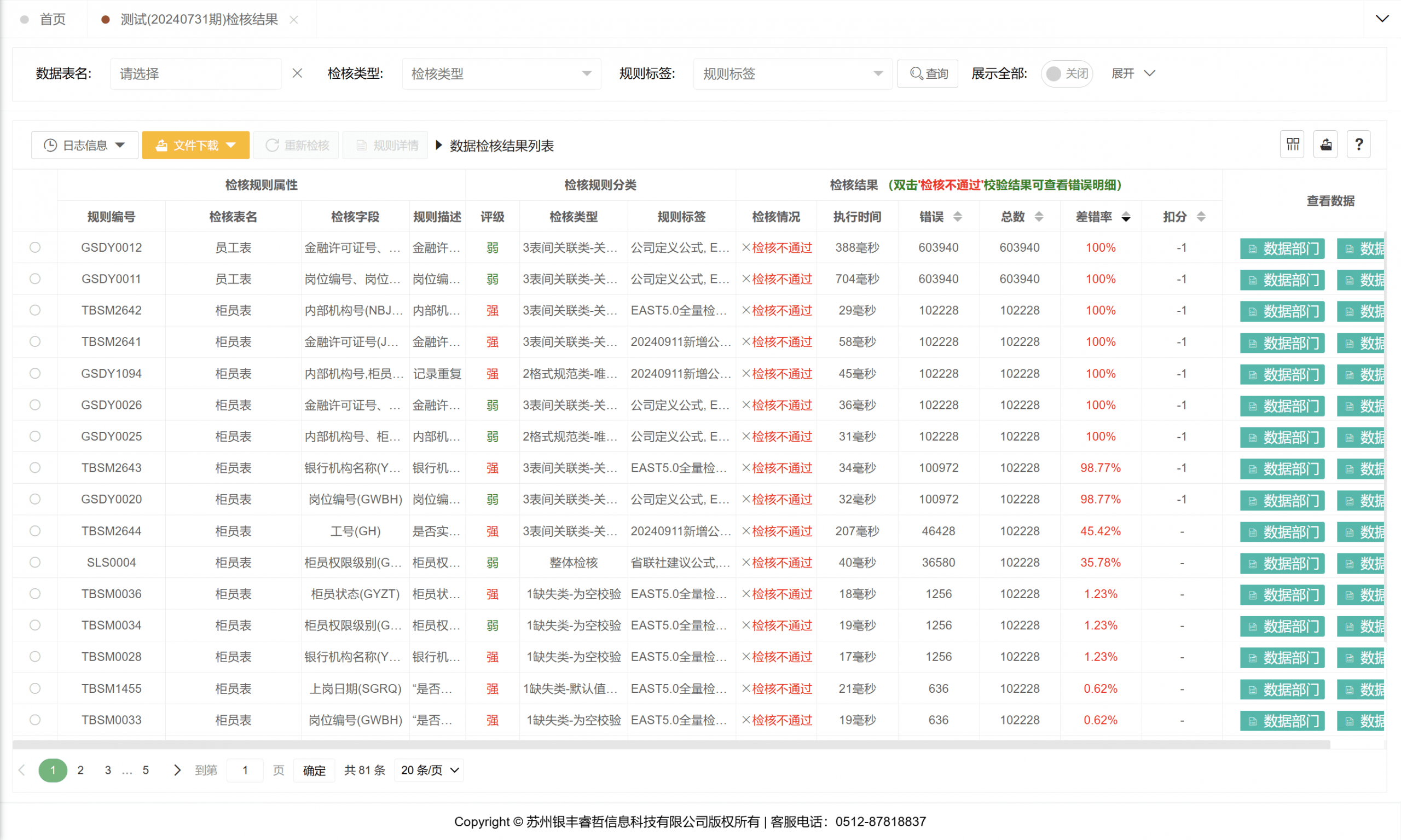 展示根据规则校验出来的数据情况列表。