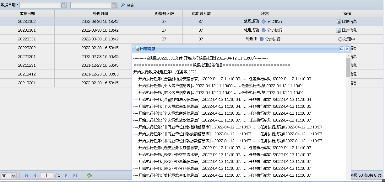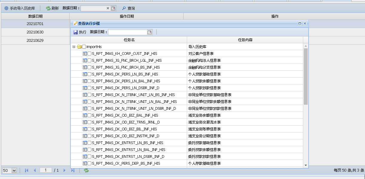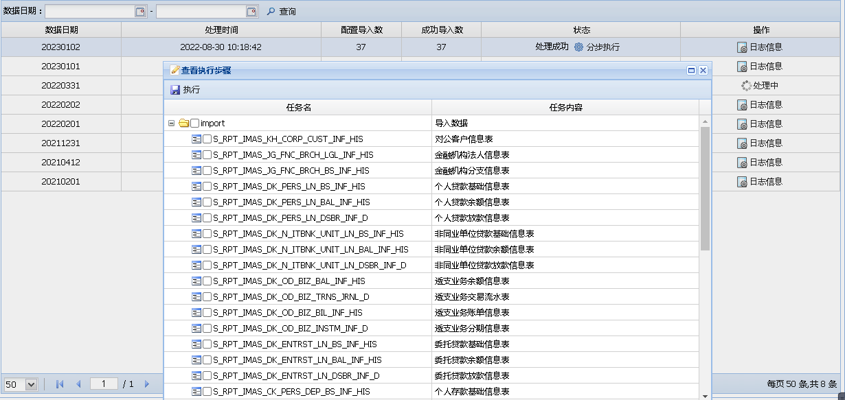 选择要导入的历史表,点击执行按钮,开始执行任务。