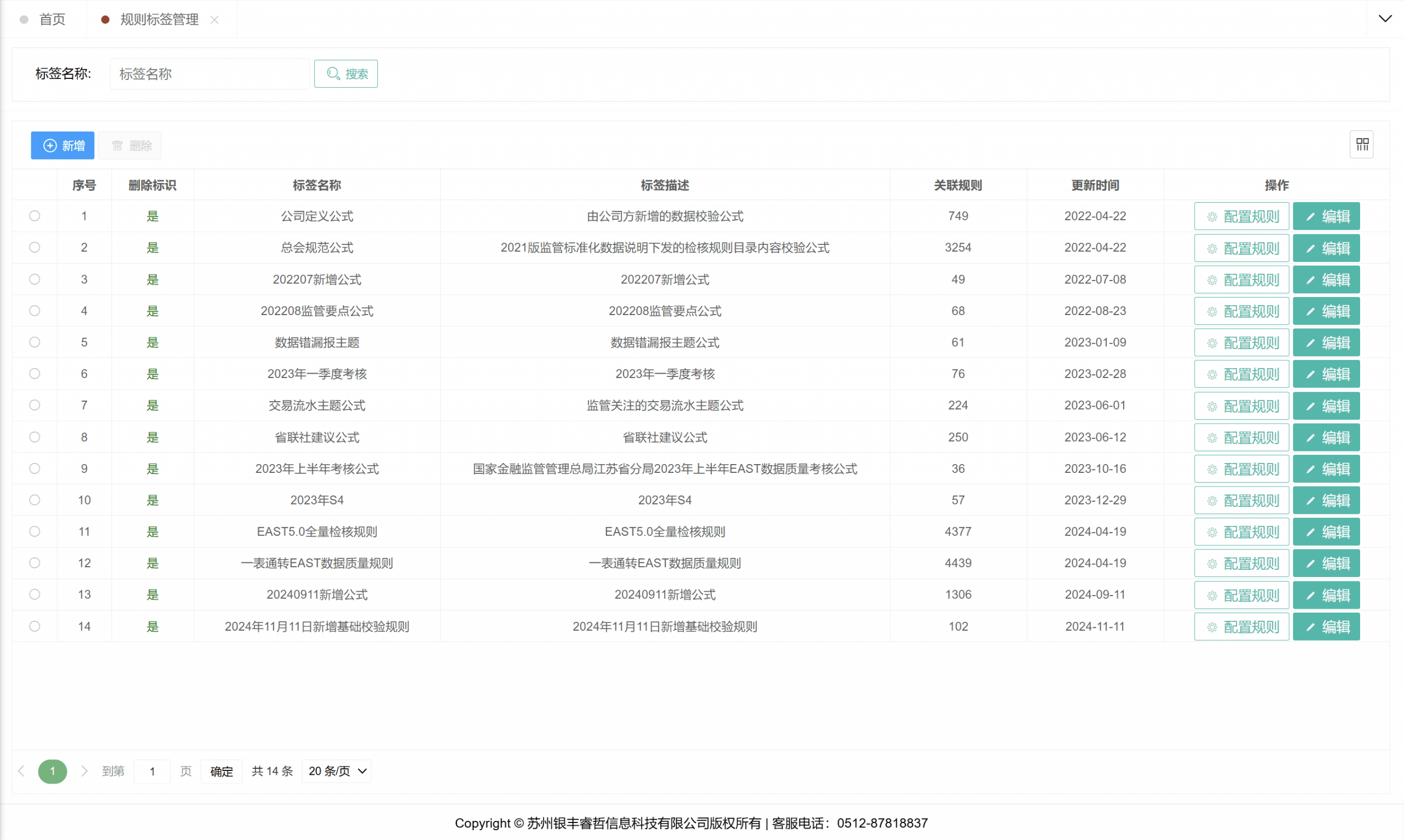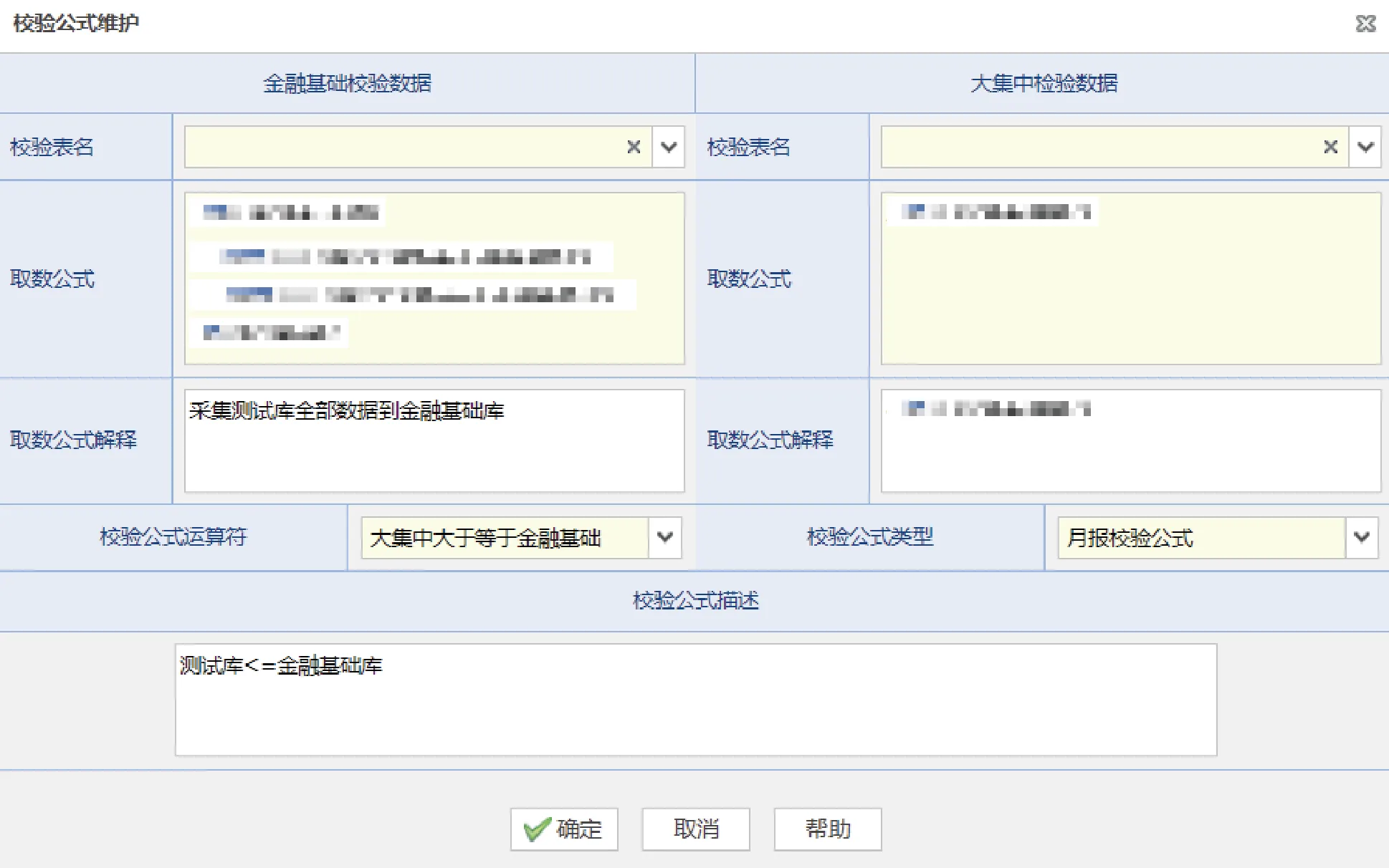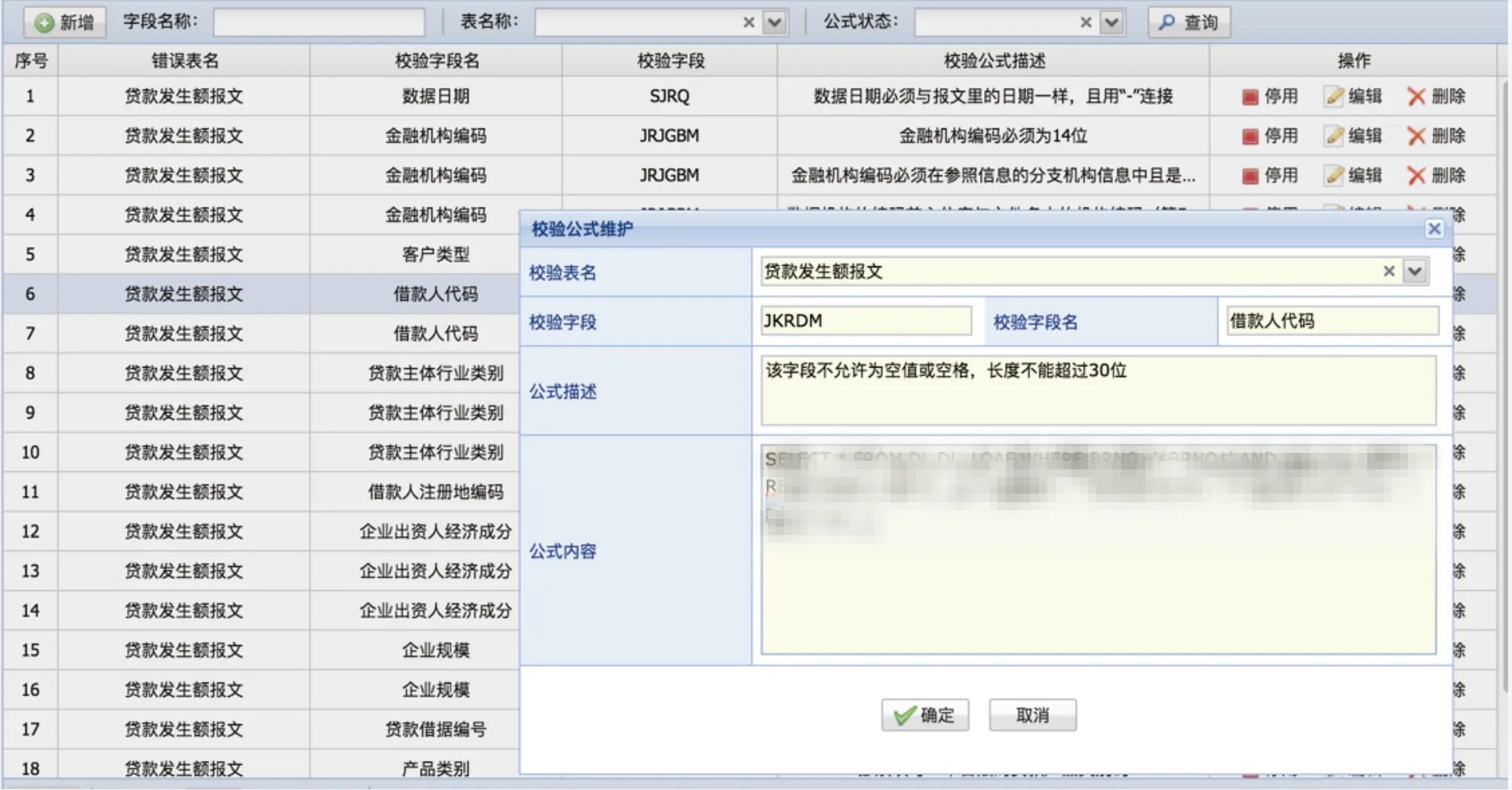 该功能模块专用于维护金融基础数据与大集中数据间的关联校验规则,支持通过表名及公式状态进行查询筛选,并提供规则的新增、编辑、删除与停用等功能。