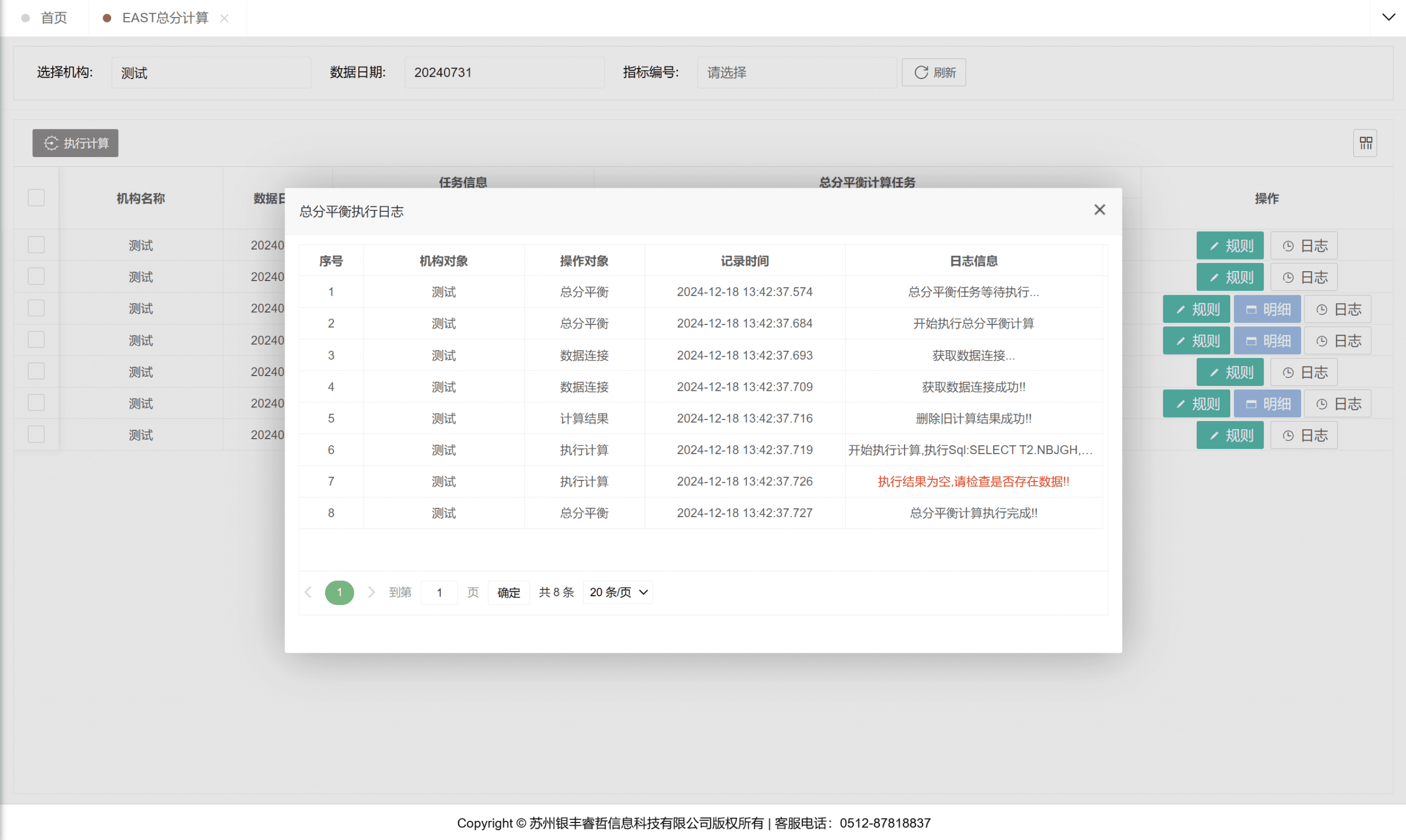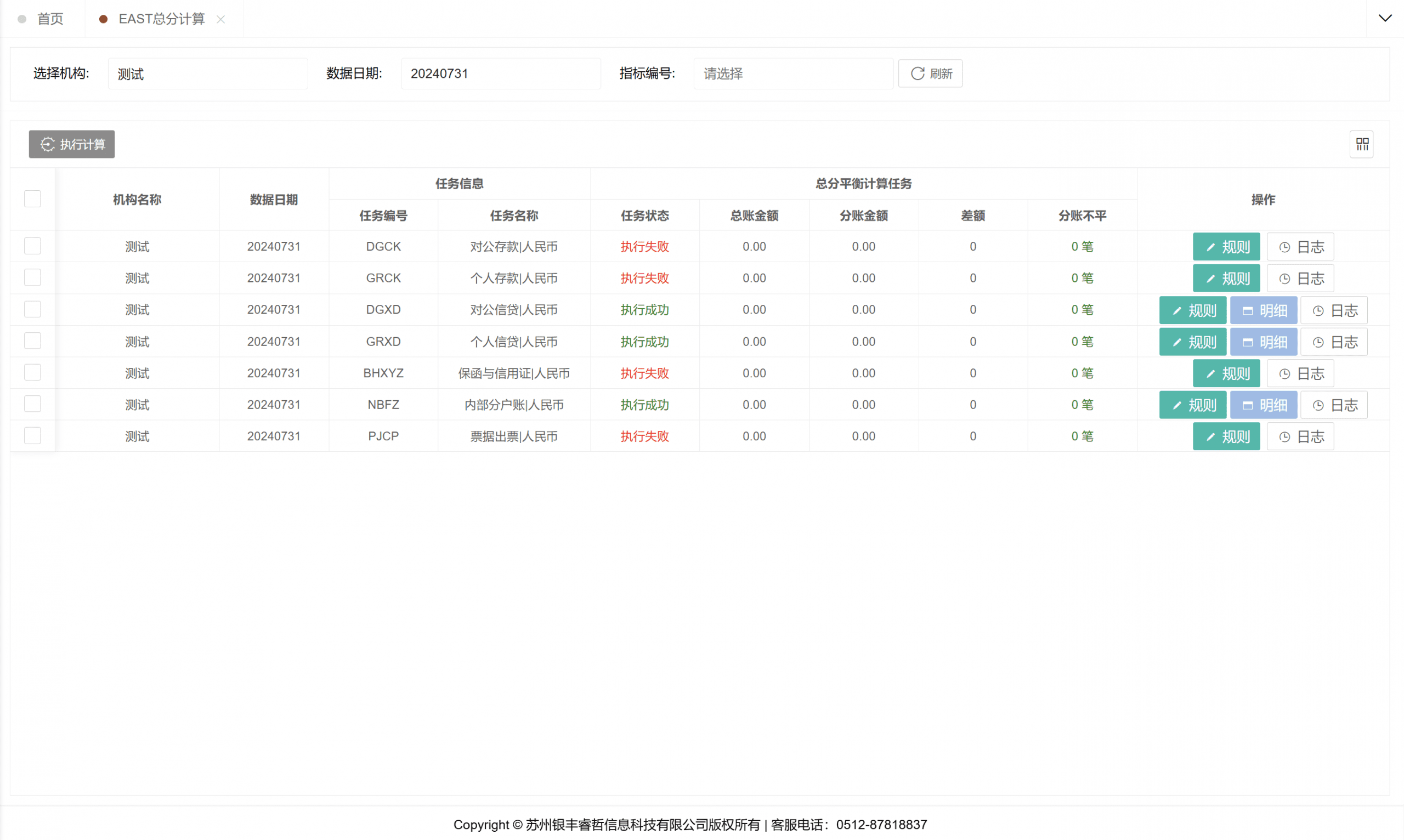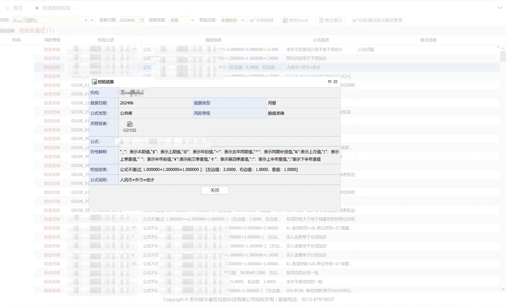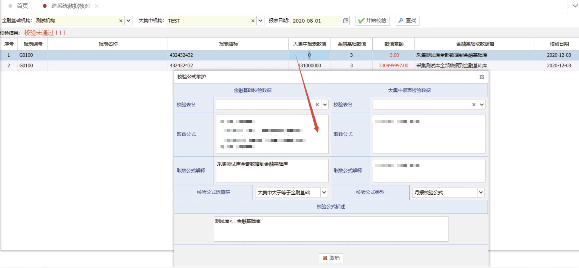 该功能主要用于执行金融基础数据与大集中系统的数据校验。用户可选定目标机构及相应日期发起校验流程,若校验未通过,系统将自动呈现错误数据明细并计算数据差异值,同时支持通过双击操作查看具体错误条目关联的校验规则详细信息。