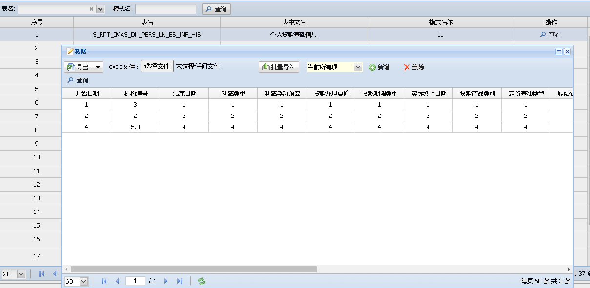 通过点击查看功能可完整展示当前数据表的全部记录列表,同时支持通过Excel上传实现批量数据导入以及数据导出操作。系统将根据预设字段属性的配置要求,在页面中以不同颜色标识进行差异化显示。