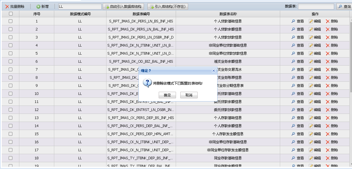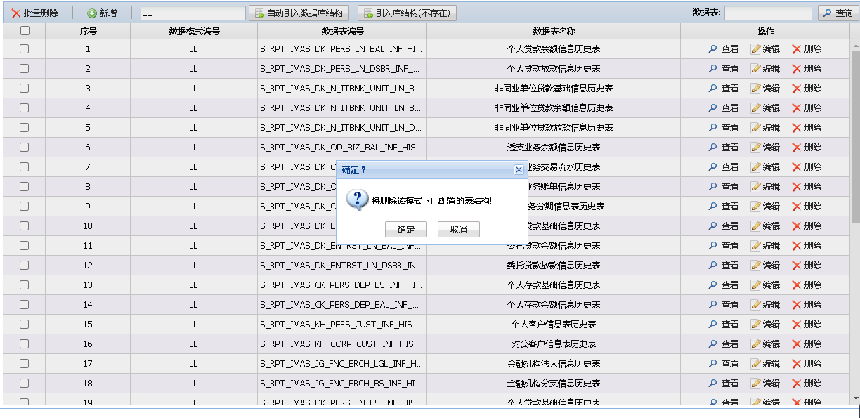 用户可通过输入模式名称并选择自动导入功能,系统将完整展示该模式下的所有数据表结构信息。