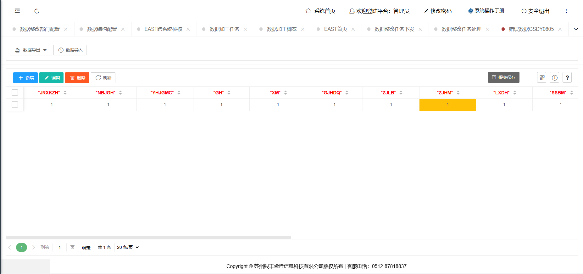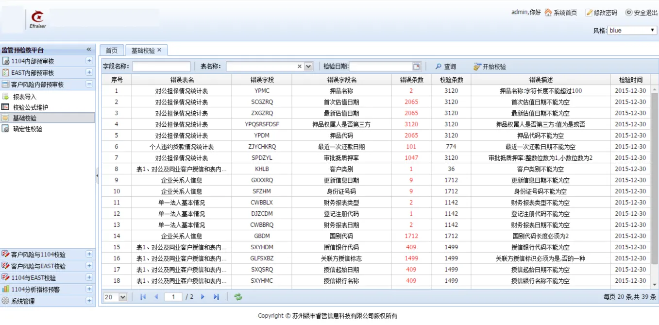 监管报送预审核系统为我公司自主研发,面向监管标准化数据开发的专业数据审核平台。我公司拥有产品的软件著作权,产品已经在国内多个省市,数百家金融机构投入使用。系统⽀持国内所有类型的银行、保险公司、财务公司、消费金融公司等系统,并且7×24小时提供现场及远程技术支持。