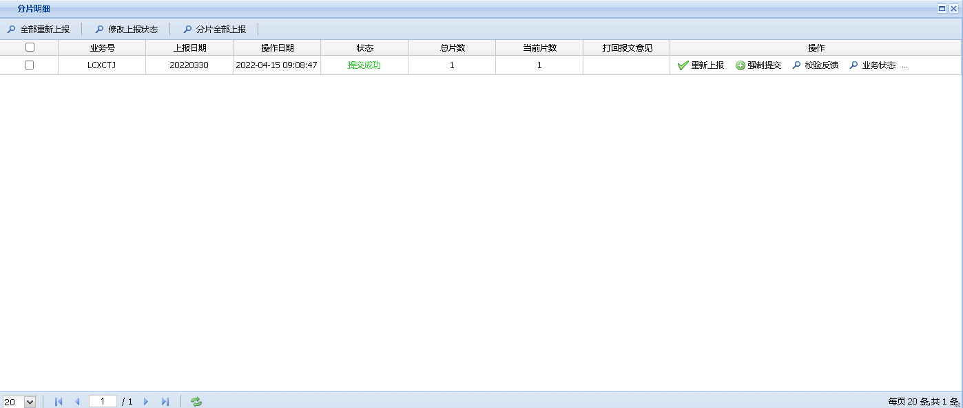 通过双击操作可查看各数据分片的上报状态,对于上报失败的情况,用户可选择执行重新上报、查阅驳回意见或进行强制提交等后续操作。