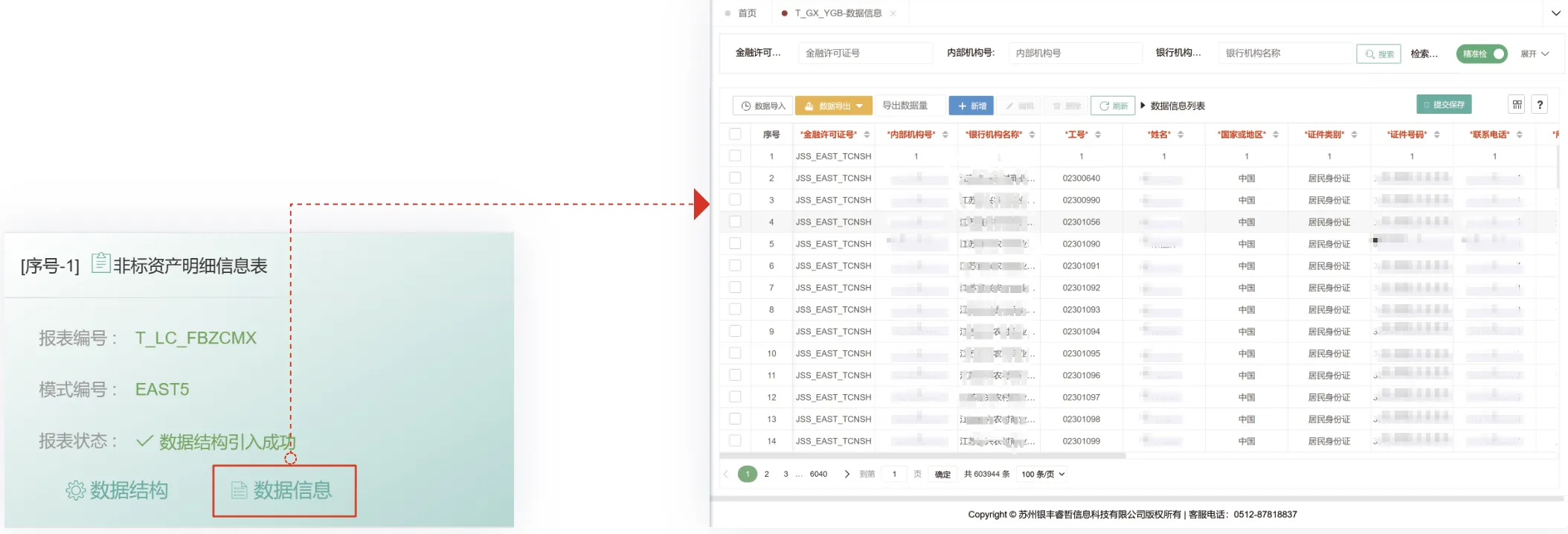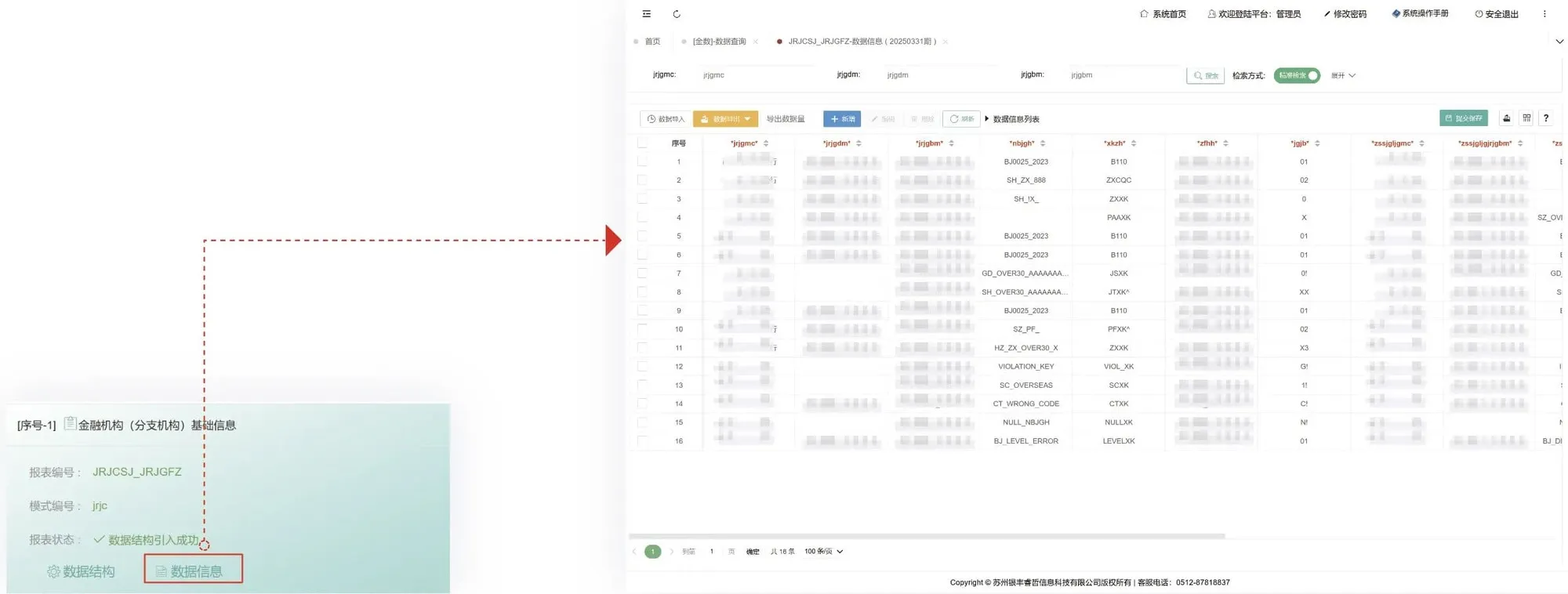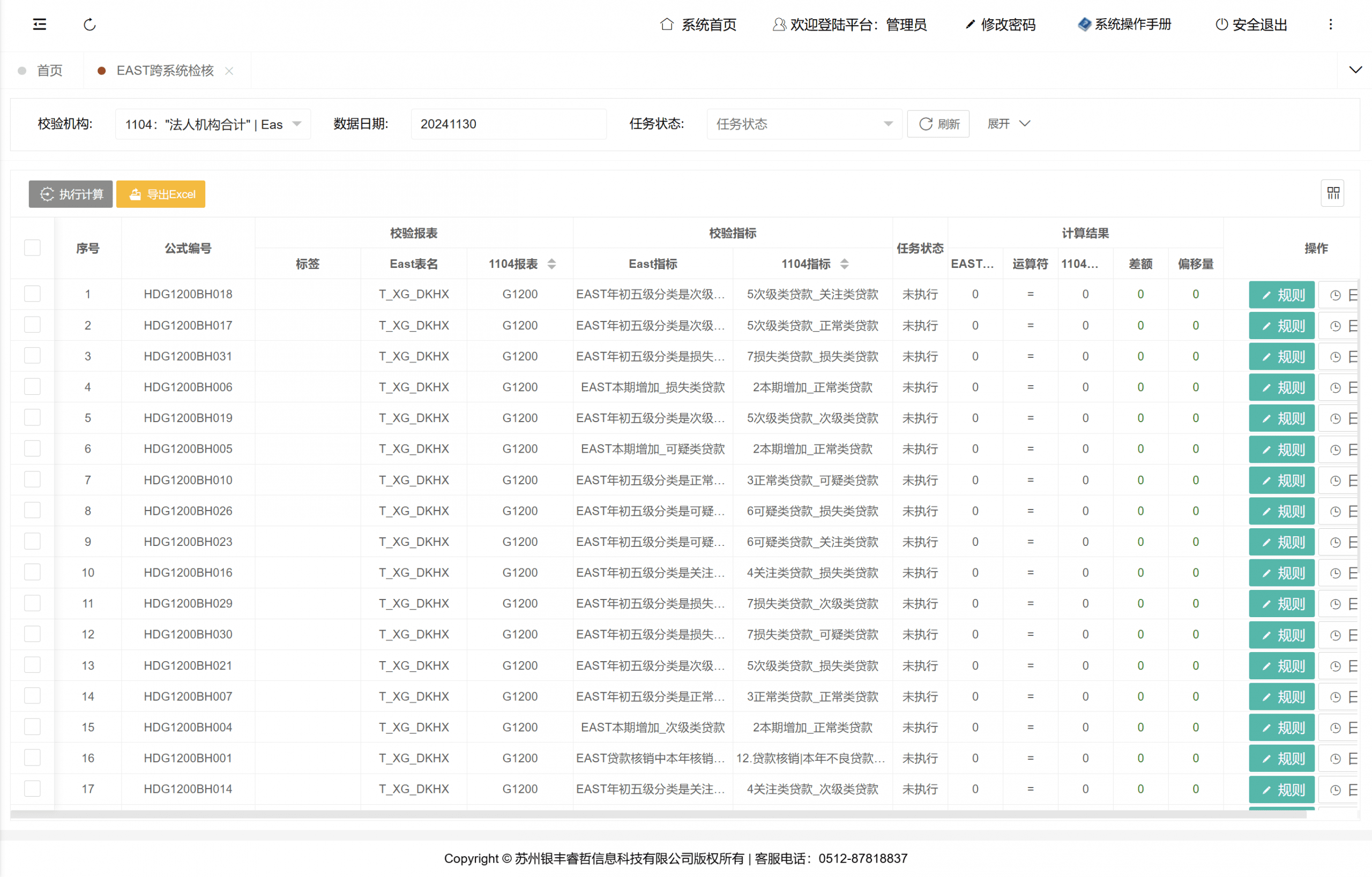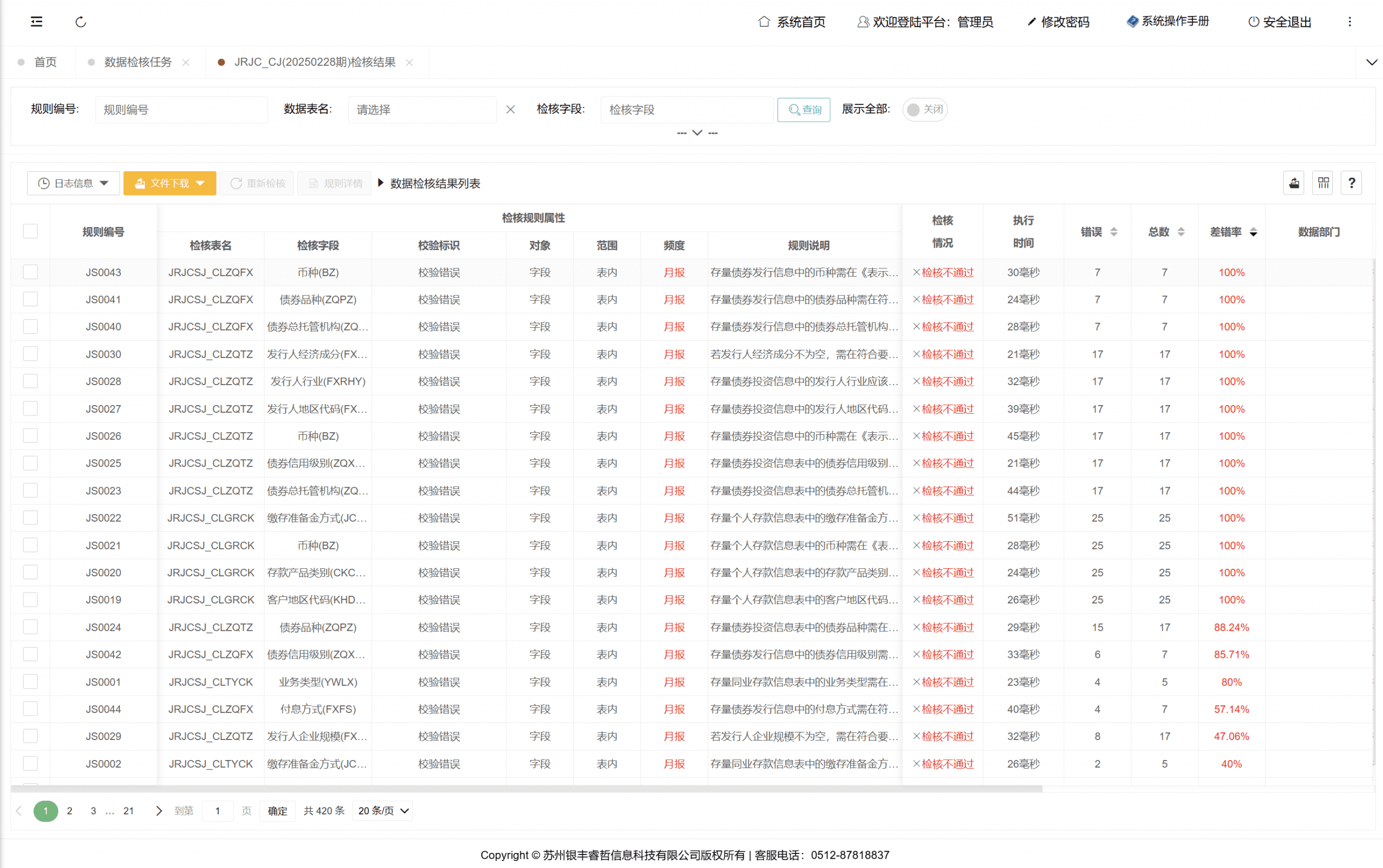 金融基础明细数据:用户可通过双击报表校验条目查看详细校验结果,包括各规则对应的校验数据明细、涉及数据总量统计,并支持重新执行校验操作。系统同时提供校验结果导出功能,且允许通过单击单条规则查看其关联的完整明细数据。
