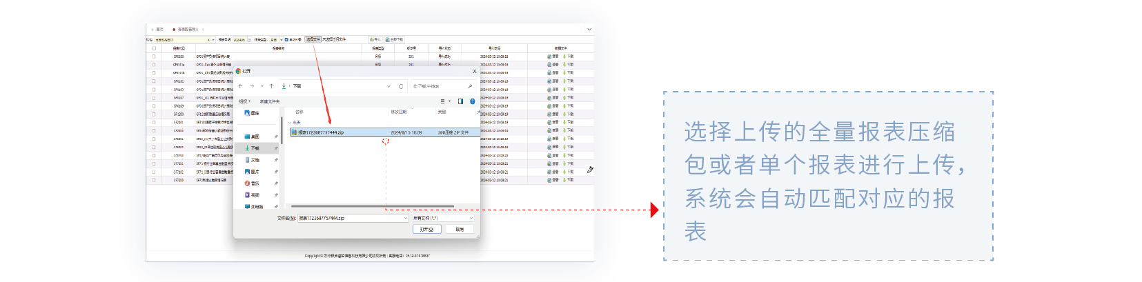 用户选择目标机构、报表类型(月报/季报/半年报/年报)及12月份的补报日期后,系统将显示待补报的报表清单。用户可选择上传Excel格式的单个文件或压缩包,确认导入后系统将执行补报操作并实时反馈导入状态。