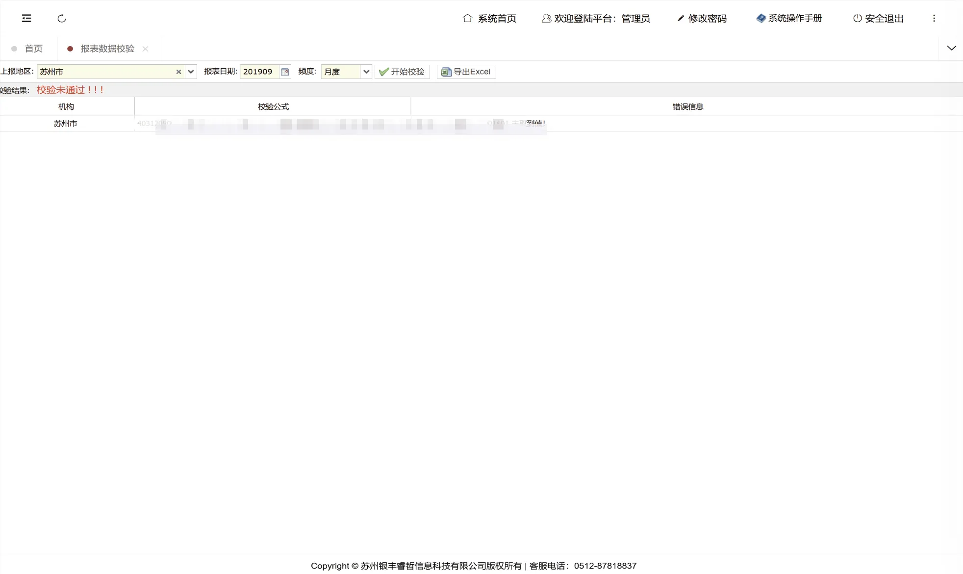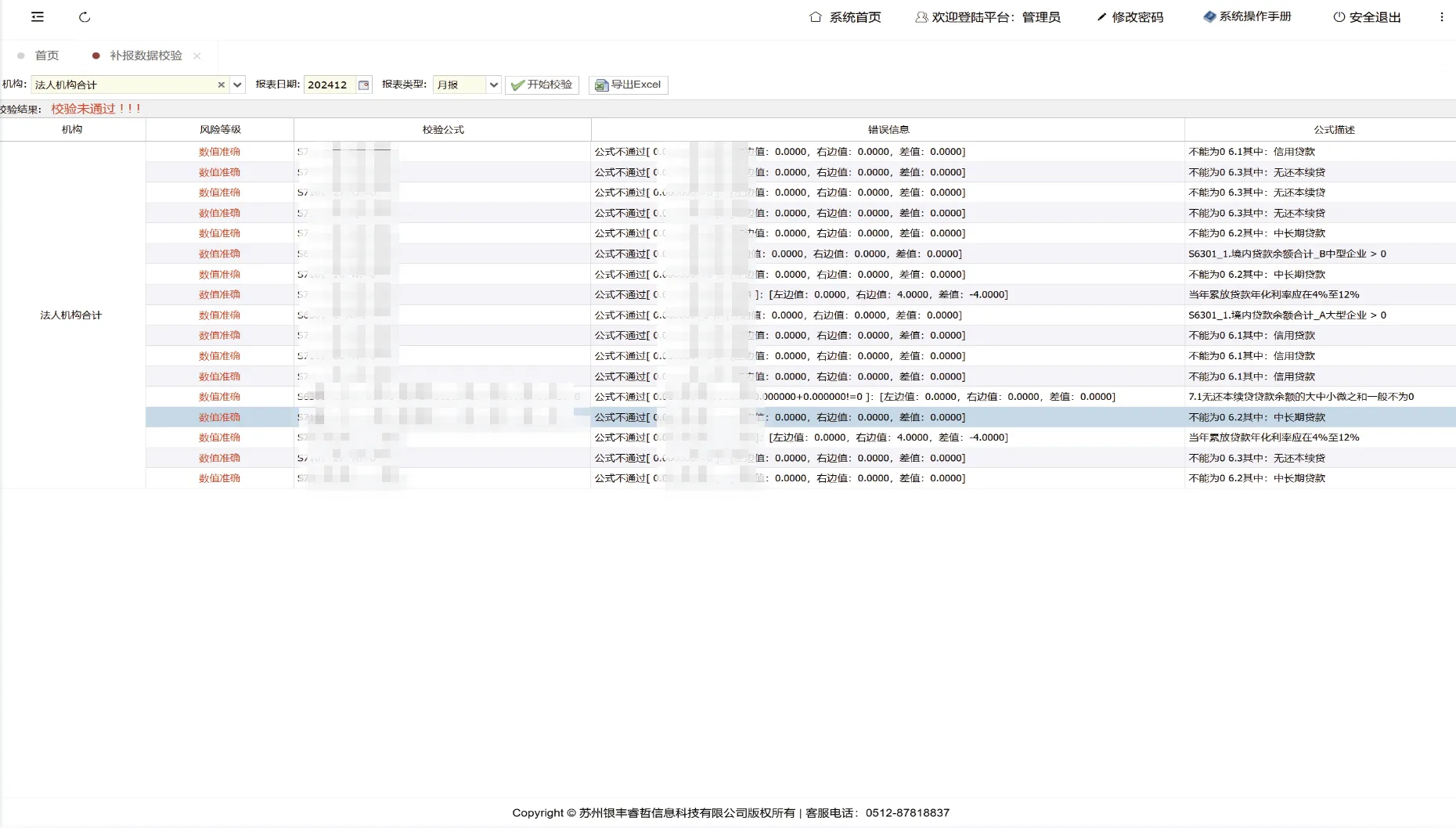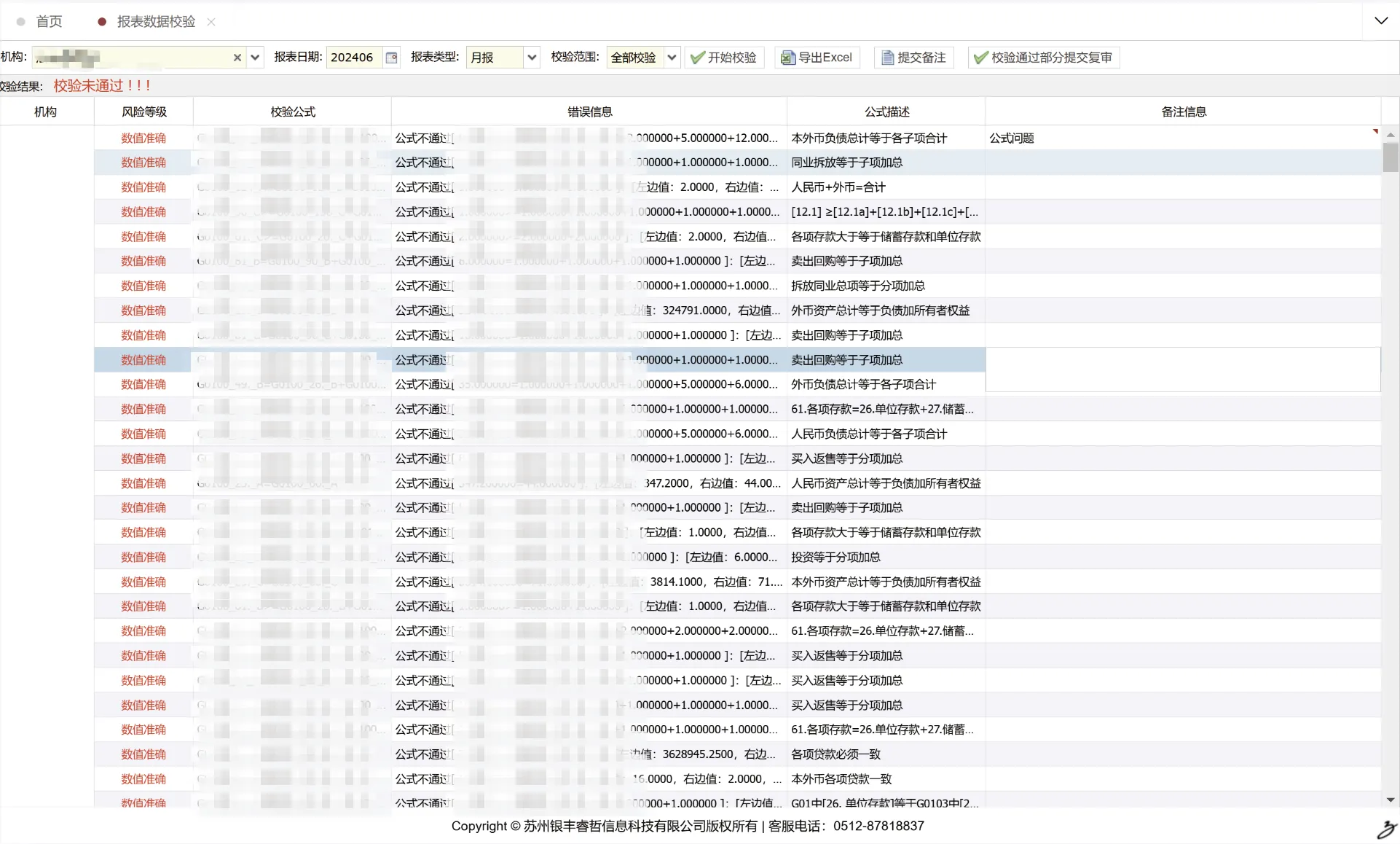 允许用户选择机构、报表日期和类型进行校验操作,生成可供查询和下载的校验结果。系统执行校验时将同时应用公共库规则和用户自建规则(不包括非admin用户定义的公式)。若所选报表尚未导入,系统将显示提示信息。用户可对校验错误添加备注并提交上级审核,校验通过的报表也可提交上级复核(相关审核记录可在报表审核管理处按权限和管辖机构查询)。所有校验结果均支持导出至Excel格式。