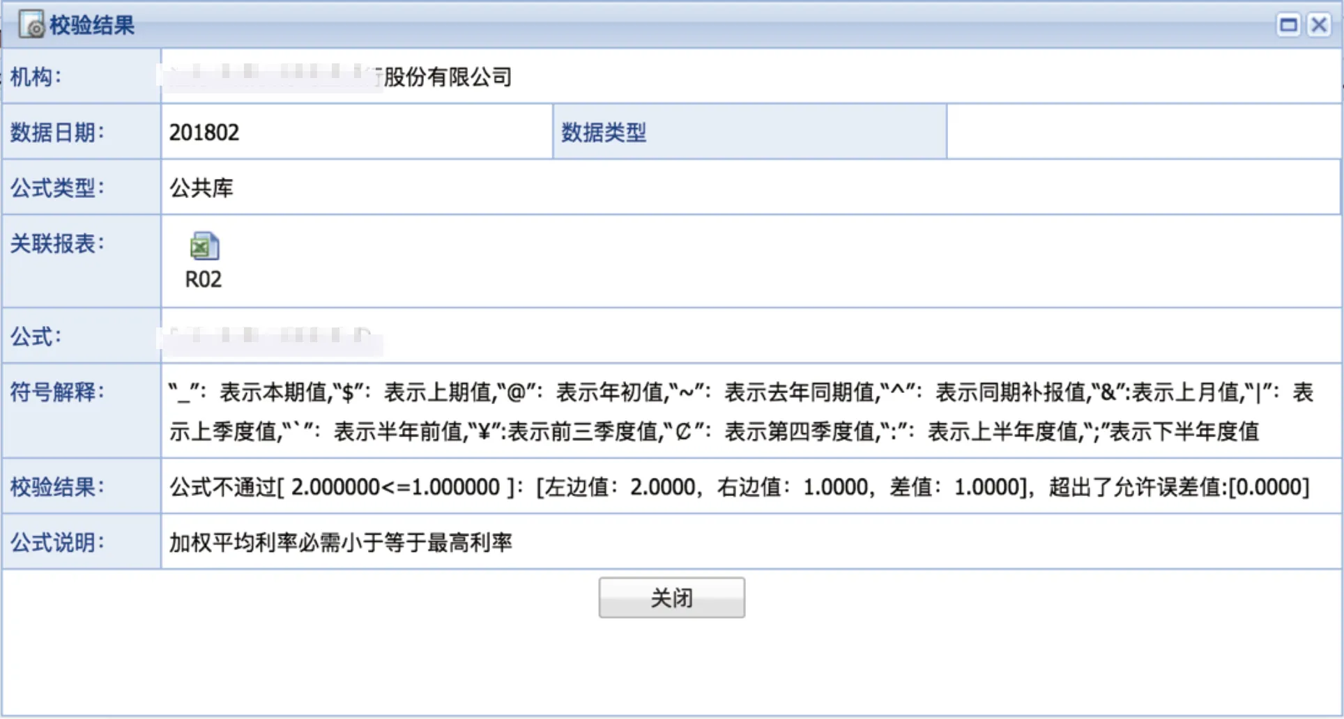 用户双击任意校验结果条目后,系统将显示校验详情页面,完整呈现该校验使用的公式定义、相关符号说明以及公式校验未通过的具体原因分析。