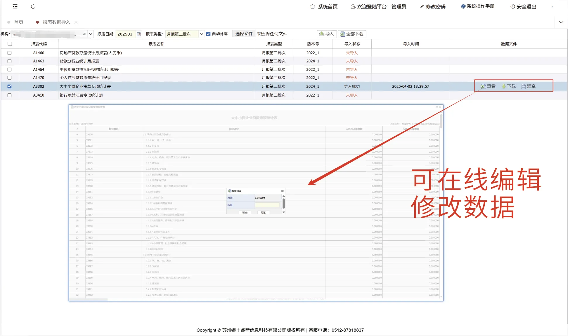 用户点击查看功能进入报表信息页面后,可浏览报表详细内容。该页面支持双击单元格编辑数据,并允许按照标准模板导出单张或多张报表。