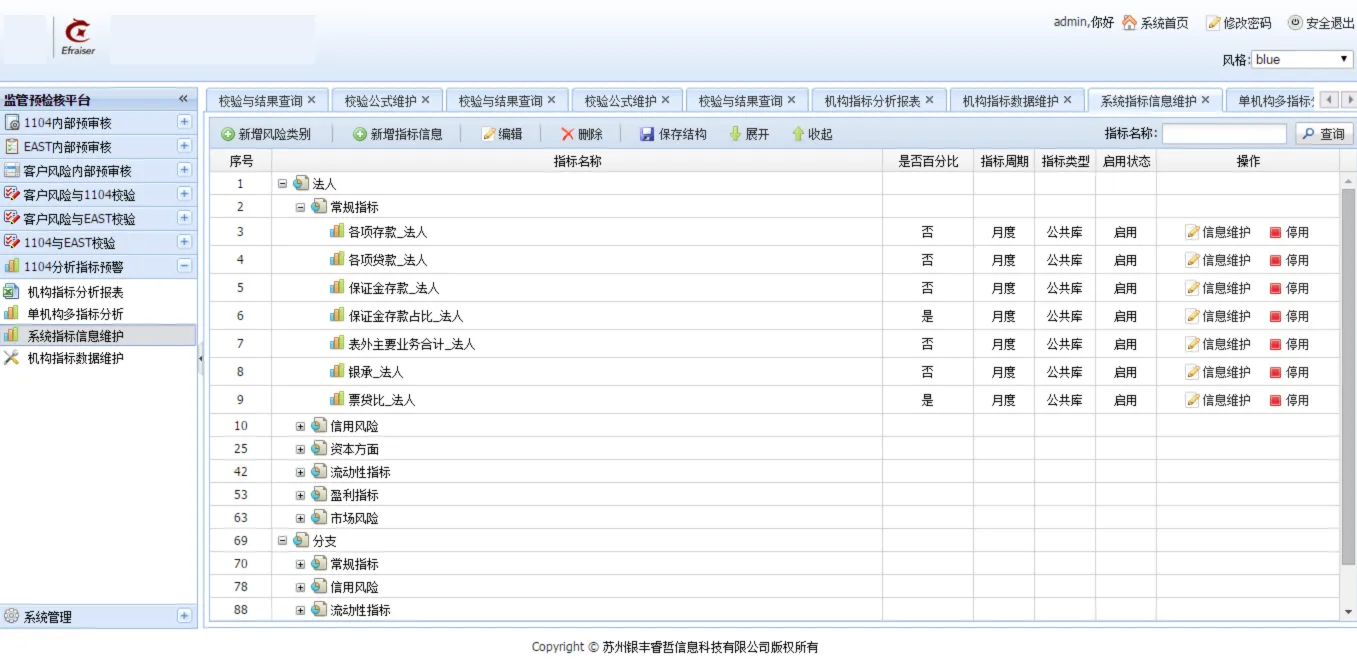 系统通过集中管理各类监管指标构建了统一的监管指标库,全面覆盖金融监管要求,并实时提供数据支持。该指标库使监管部门能够高效获取关键指标数据,实现全方位监控和风险预警。