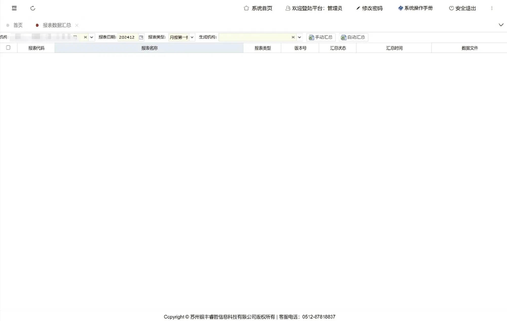 点击手动生成报文,选择金融机构、上报的数据日期、需要生成的数据表。