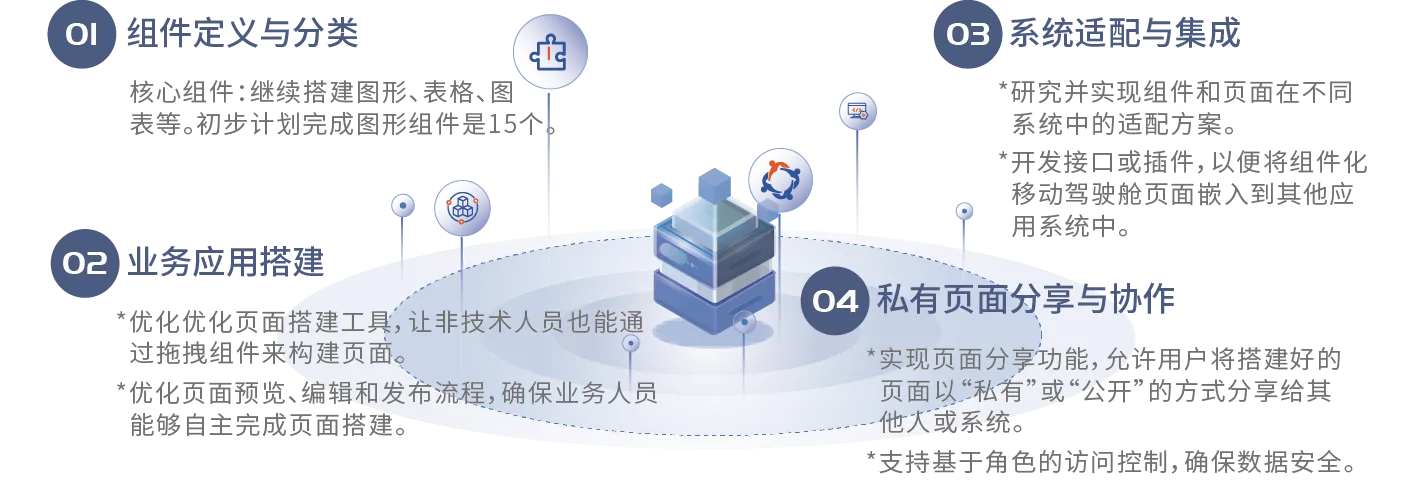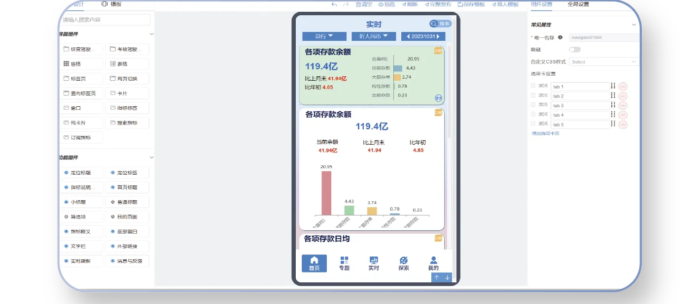 目前,已开发了30个标准化组件,并可通过设计器内的拖拽功能,将这些标准的组件搭建成组件树。用户能够利用设计器中的组件设置功能,灵活调整以配置出多样化的组件树。同时,应用支撑系统控制权限,确保数据的安全性和页面的多样性。最终,通过发布模板展示MBI管理驾驶舱页面。