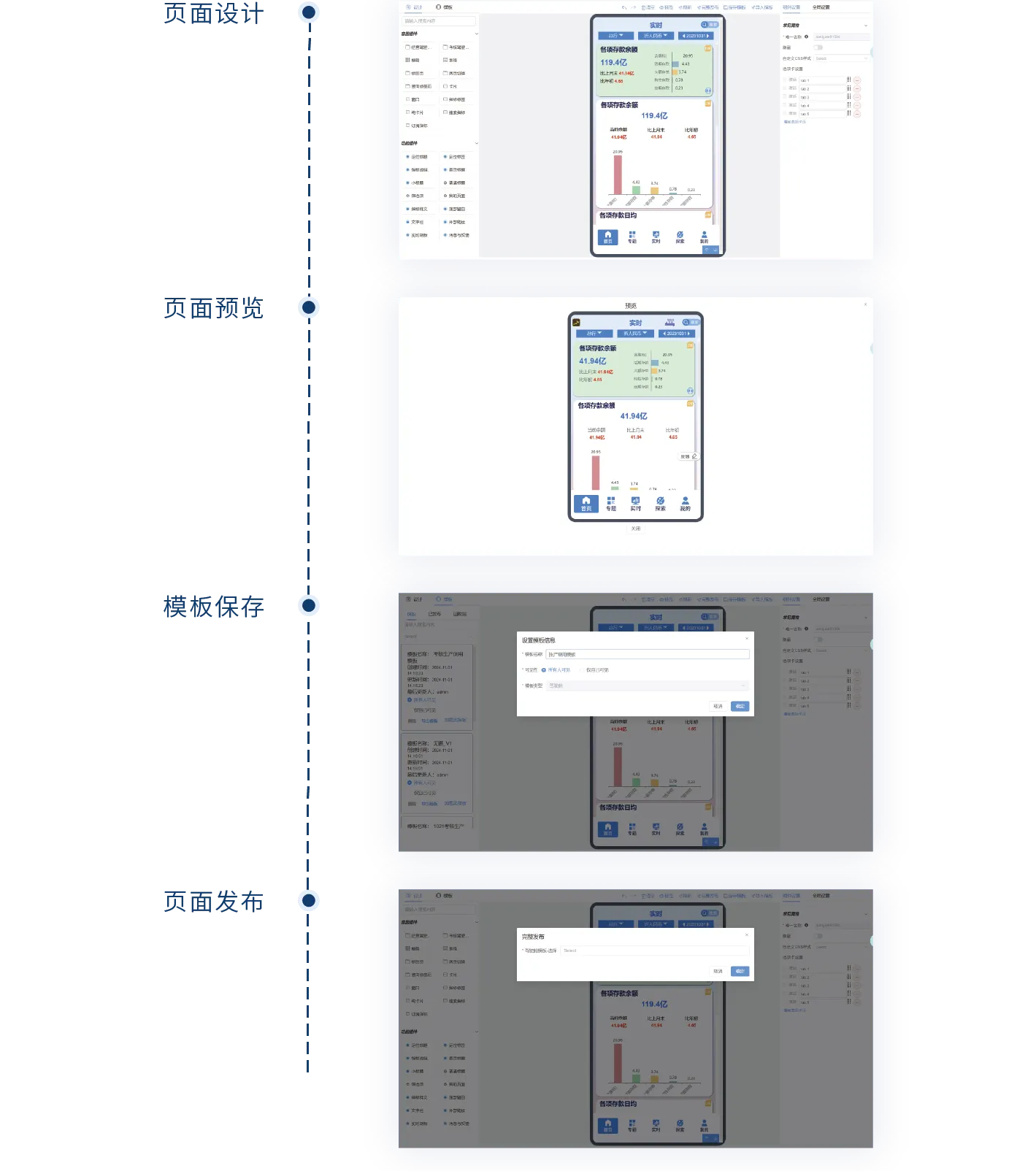 支持页面预览、编辑、模版保存和发布。