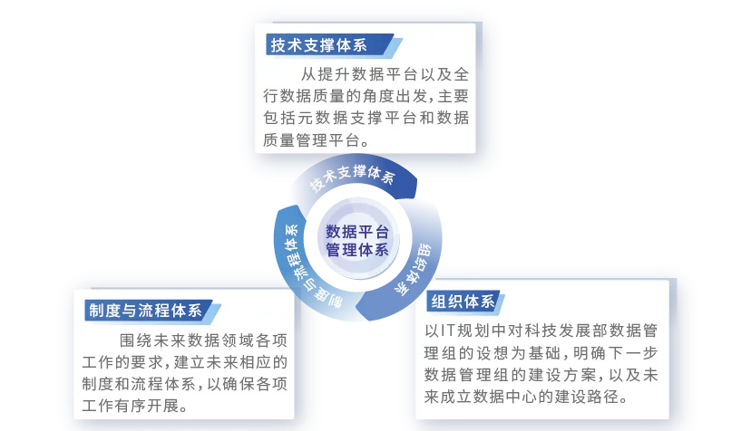 数据平台管理包含组织体系、制度与流程体系和技术支撑体系。其中,组织体系作为数据管理平台的基础,制度与流程体系是数据管理平台的保障,技术体系是数据管理平台的物理载体。