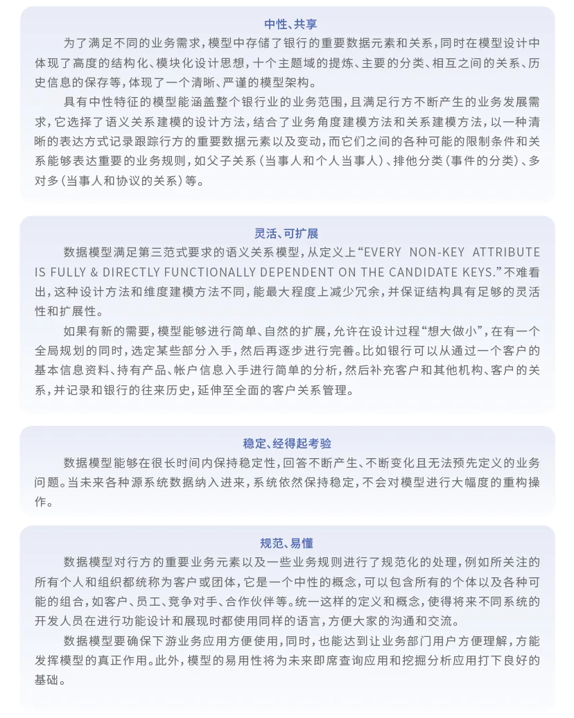 数据模型采用面向主题的设计方法,有效组织来源多样的业务数据,使用统一的逻辑语言描述银行业务,是数据管理的分析工具和交流的有力手段;保证数据的一致性,是银行实现业务智能的重要基础。