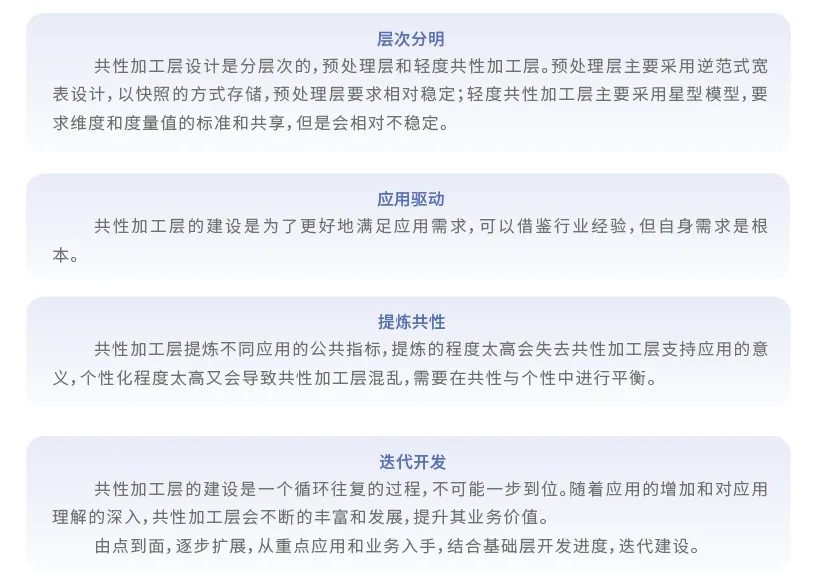 共性加工层是从业务的视角出发,提炼出对数据仓库具有共性的数据访问、统计需求,从而构建出的一个面向支持应用的、提供共享的数据访问服务的公共数据。它所遵循的设计原则主要包括: