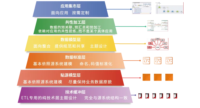 数据仓库采用得到业界普遍认可的6层架构: