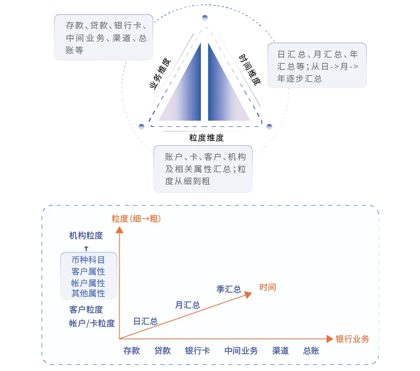 比如存款账户日汇总,业务维度是存款,粒度维度是账户级,时间维度是日;网点存款月汇总,业务维度是存款,粒度维度是机构和存款属性,时间维度是月汇总。
