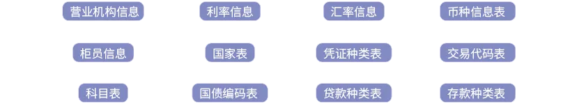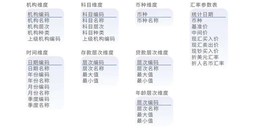 维度信息,比如机构维度、科目维度、币种维度、汇率参数、时间维度、年龄层次、存贷款金额层次等: