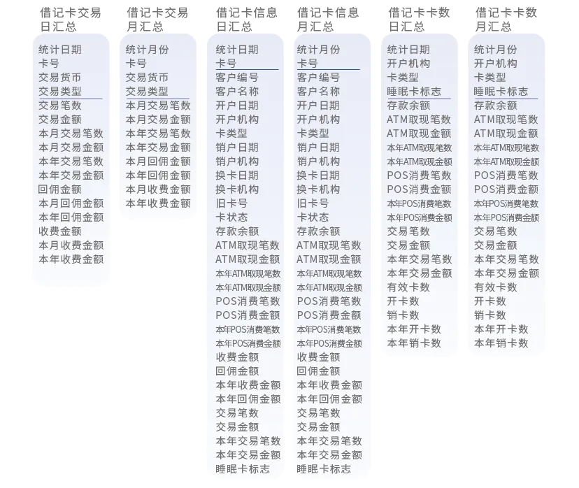 借记卡交易日汇总、借记卡交易月汇总‘借记卡信息日汇总、借记卡信息月汇总、借记卡卡数日汇总、借记卡卡数月汇总、贷记卡交易日汇总、贷记卡交易月汇总、贷记卡信息日汇总、贷记卡信息月汇总、贷记卡卡数日汇总、贷记卡卡数月汇总