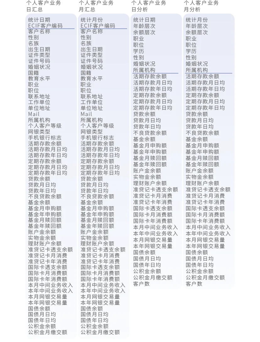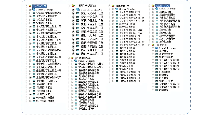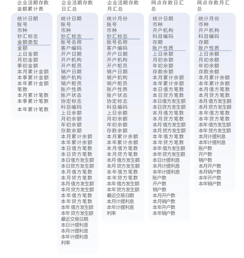 个人活期存款帐户日汇总、个人活期存款帐户月汇总、个人定期存款帐户日汇总、个人定期存款帐户月汇总、企业活期存款帐户日汇总、企业活期存款帐户月汇总、企业定期存款帐户日汇总、企业定期存款帐户月汇总、网点存款日汇总、网点存款月汇总、贷款账户日汇总、贷款账户月汇总、网点贷款日汇总、网点贷款月汇总