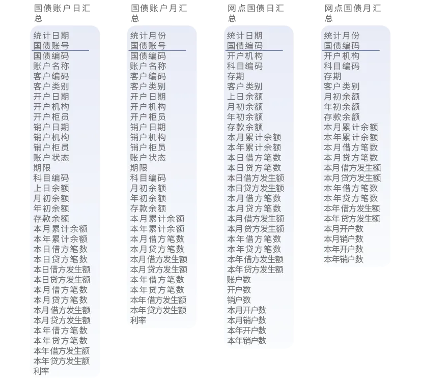 个人公积金账户日汇总、个人公积金账户月汇总、国债账户日汇总、国债账户月汇总、网点国债日汇总、网点国债月汇总、基金账户交易月汇总、基金客户资产月汇总、国业结算量汇总日表、国业结算量汇总月表、企业代发工资汇总日表、企业代发工资汇总月表、理财账户交易月汇总、理财客户资产月汇总、网点中间业务月汇总