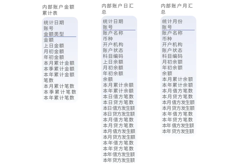 包括: 内部帐账户日汇总、内部帐账户月汇总